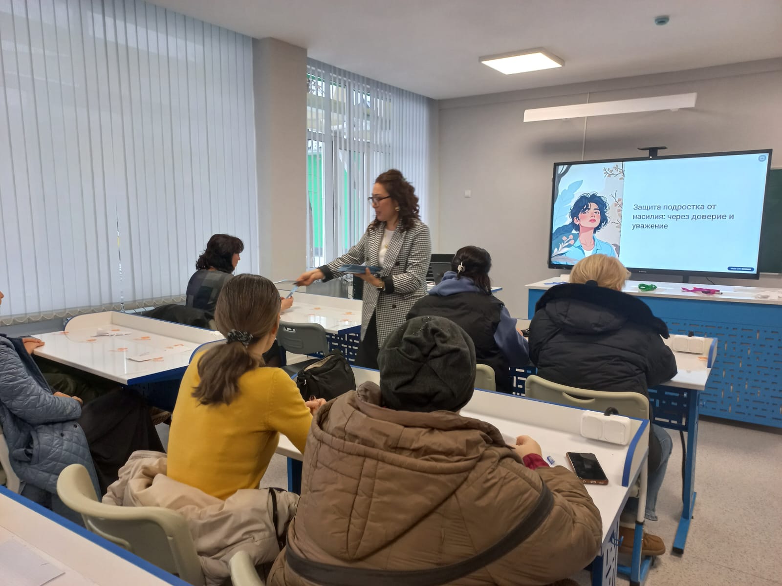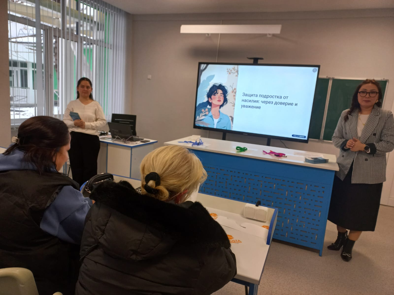 Ата-аналарды педагогикалық қолдау орталығының бағдарламасы аясында педагог-психолог Н.Д. Кожағулова, әлеуметтік педагог А.И. Мартюк, директордың тәрбие работе жөніндегі орынбасары Г.А. Михеева 5-9 сынып ата-аналарымен «Жасөспірімді зорлық-зомбылықтан жеке адамды құрметтеу және сенім арқылы қорғау» атты сабақ-тренинг өткізді.