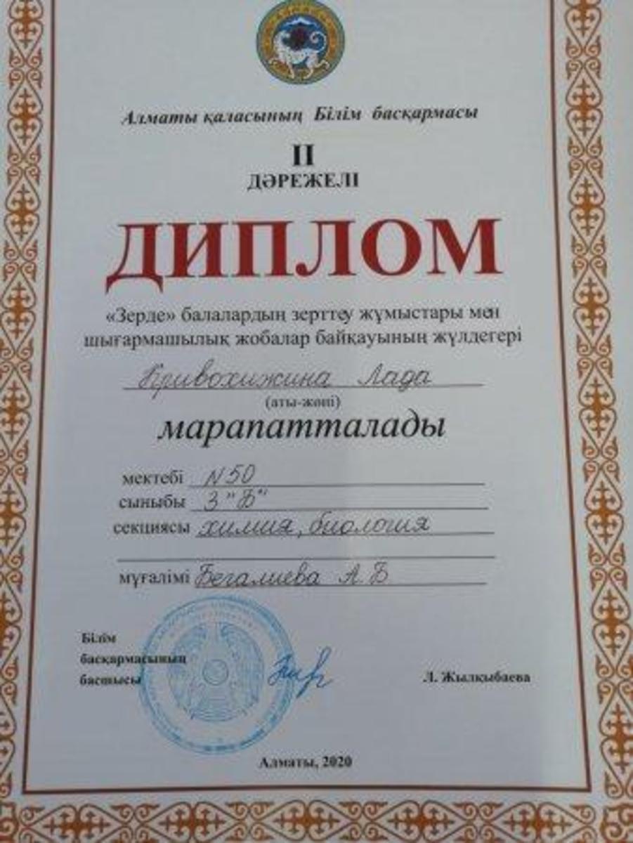 Ученица 3 «Б» класса КГУ ОШ № 50 Кривохижина Лада, под руководством учителя начальных классов Бегалиевой А.Б., заняла 2 место в городском этапе Республиканского конкурса «Зерде» научно-исследовательских проектов учащихся 1-7 классов (секция: химия, биология)