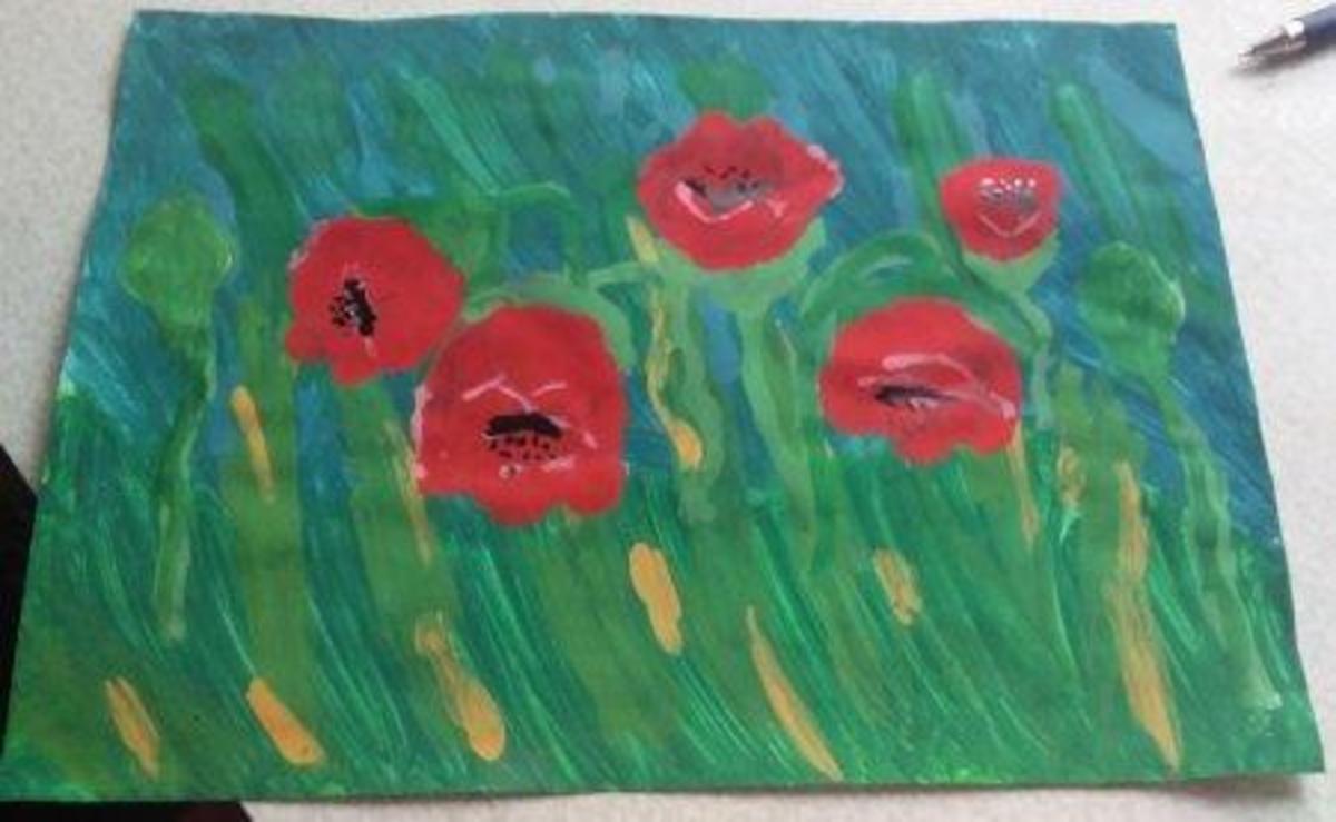 Лукьянчик З. ученик 3,,А"класса назвал свою картину:,, Маки в степи".
