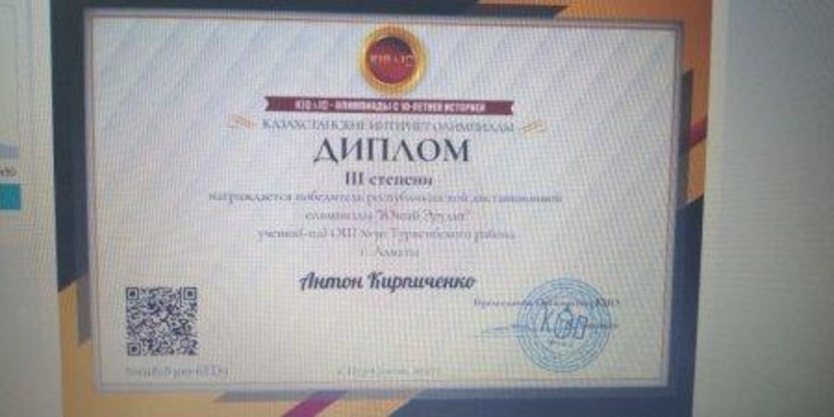 Кирпиченко А. награждён дипломом 3 степени за участие в республиканской дистанционной олимпиаде,, Юный эрудит".