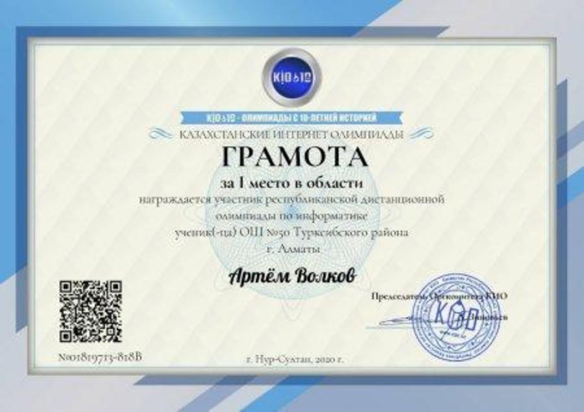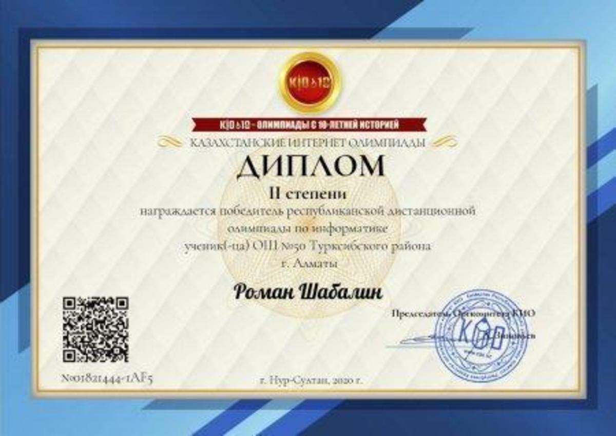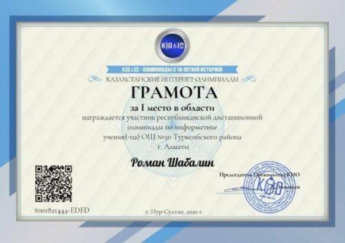 Ученик 7,,В"класса КГУ ОШ 50 Шабалин Р. награждён грамотой за 1 место в области, грамотой за 1 место в районе и дипломом 2 степени в республиканской