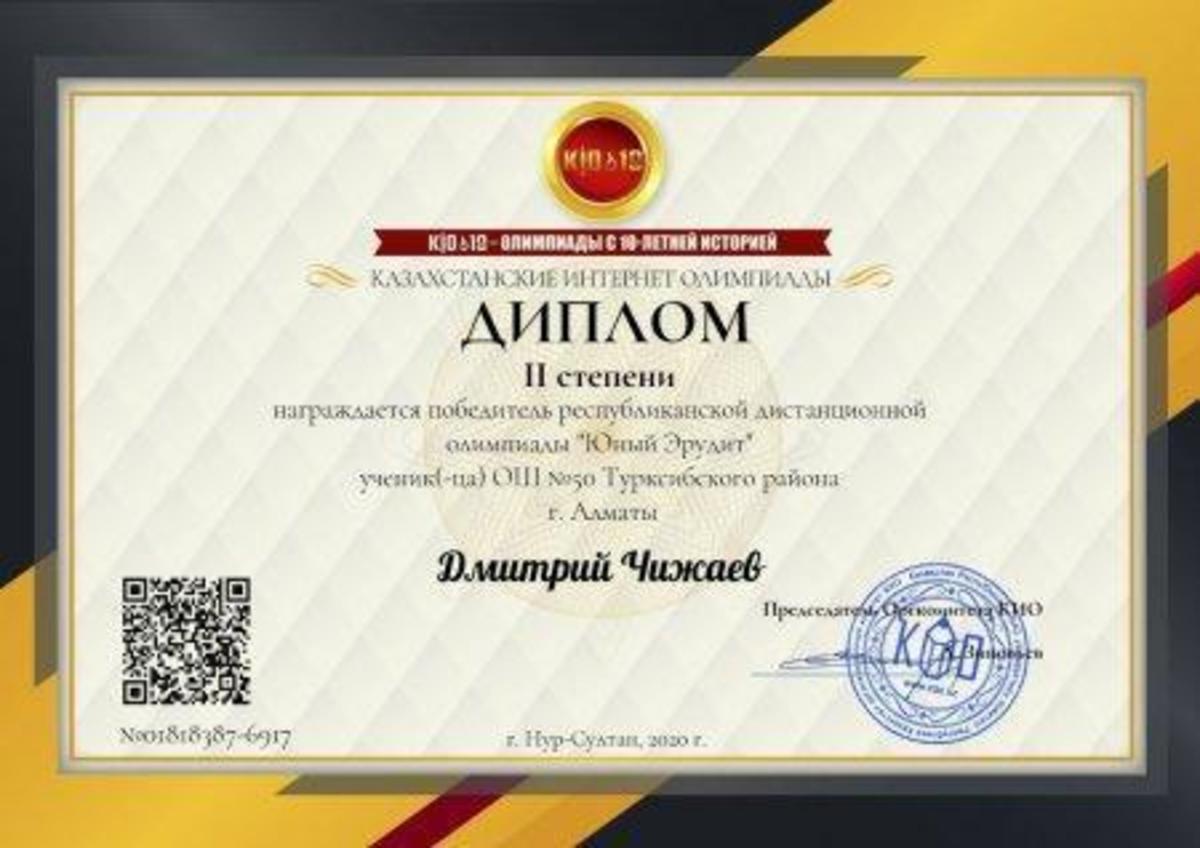 Чижаев Д. награждён дипломом 2 степени за участие в республиканской дистанционной олимпиаде по информатике,, Юный эрудит ".