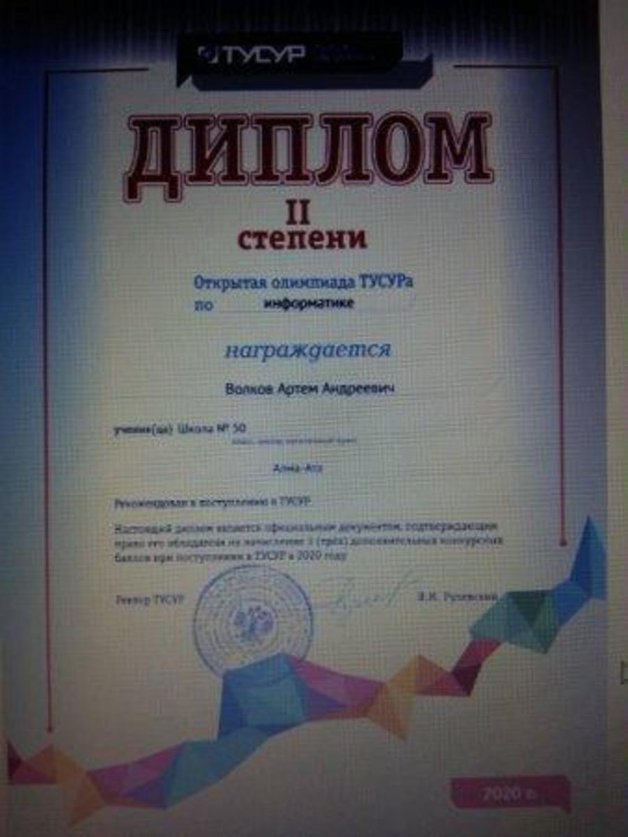 Ученик 11,,А"класса Волков А. награждён грамотой за 1 место в области и дипломом 2 степени за участие в республиканской дистанционной олимпиаде по информатике