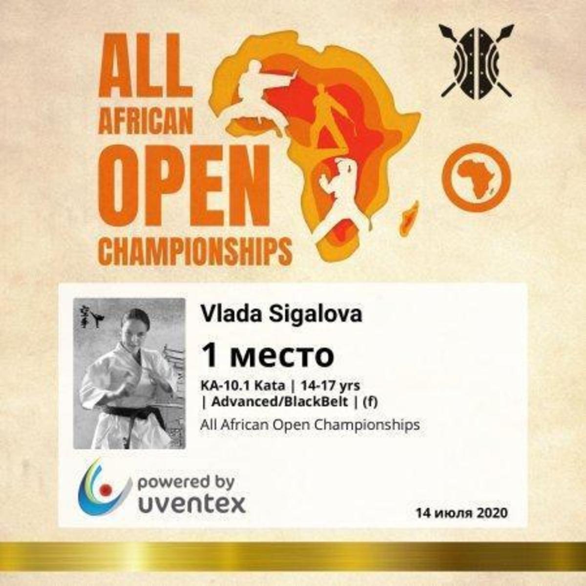 Ученица 9 класса КГУ ОШ 50 Сигалова Влада заняла 1 место в открытом онлайн чемпионате Африки по каратэ среди подростков 14-17 лет, категория Ката, черный пояс.