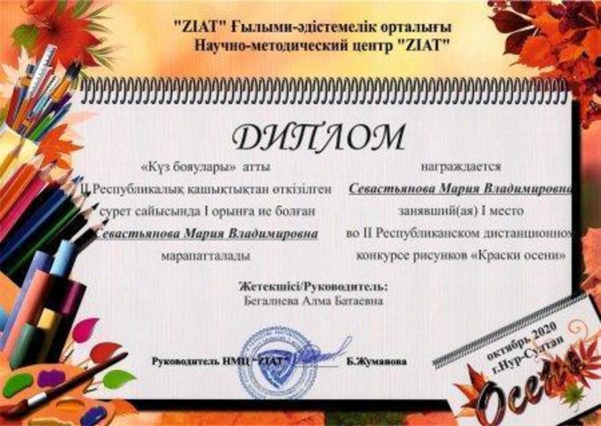 Дипломом награждена ученица 4 ,,Б" класса КГУ ОШ 50 Севастьянова Мария, занявшая 1 место во 2 Республиканском дистанционном конкурсе рисунков ,, Краски осени". Классный руководитель : Бегалиева А. Б.