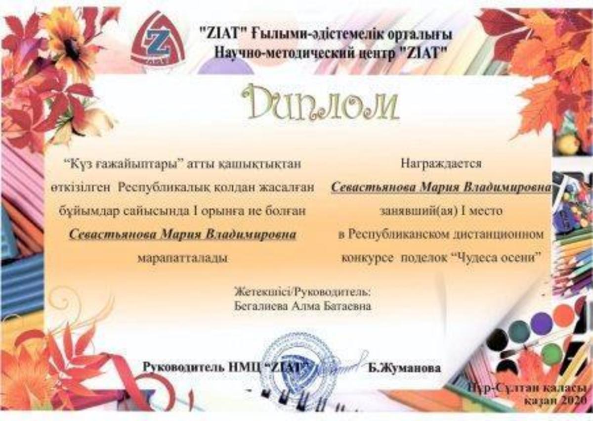 16 қараша 2020 0 1 2 3 4 5 Республиканский дистанционный конкур поделок ,,Чудеса осени" Ученица 4,,Б"класса КГУ ОШ 50 Севастьянова Мария награждена дипломом за 1 место в Республиканском дистанционном конкурсе поделок,, Чудеса осени". Классный руководитель : Бегалиева А. Б.