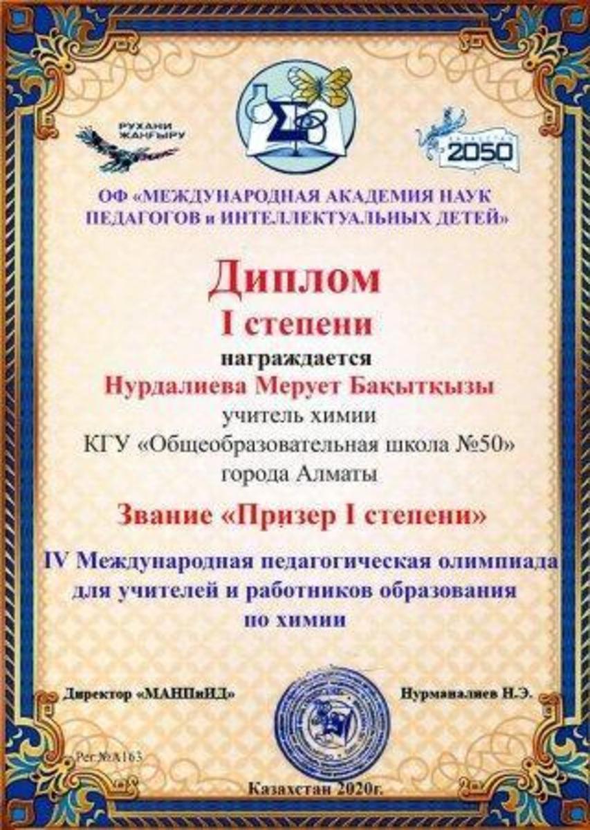 25 қараша 2020 0 1 2 3 4 5 Участие в 4 Международной педагогической олимпиаде Нурдалиева М.Б. учитель химии КГУ ОШ 50 награждена дипломом 1 степени, звание,, Призёр 1 степени" за участие в 4 Международной педагогической олимпиаде для учителей и работников образования.