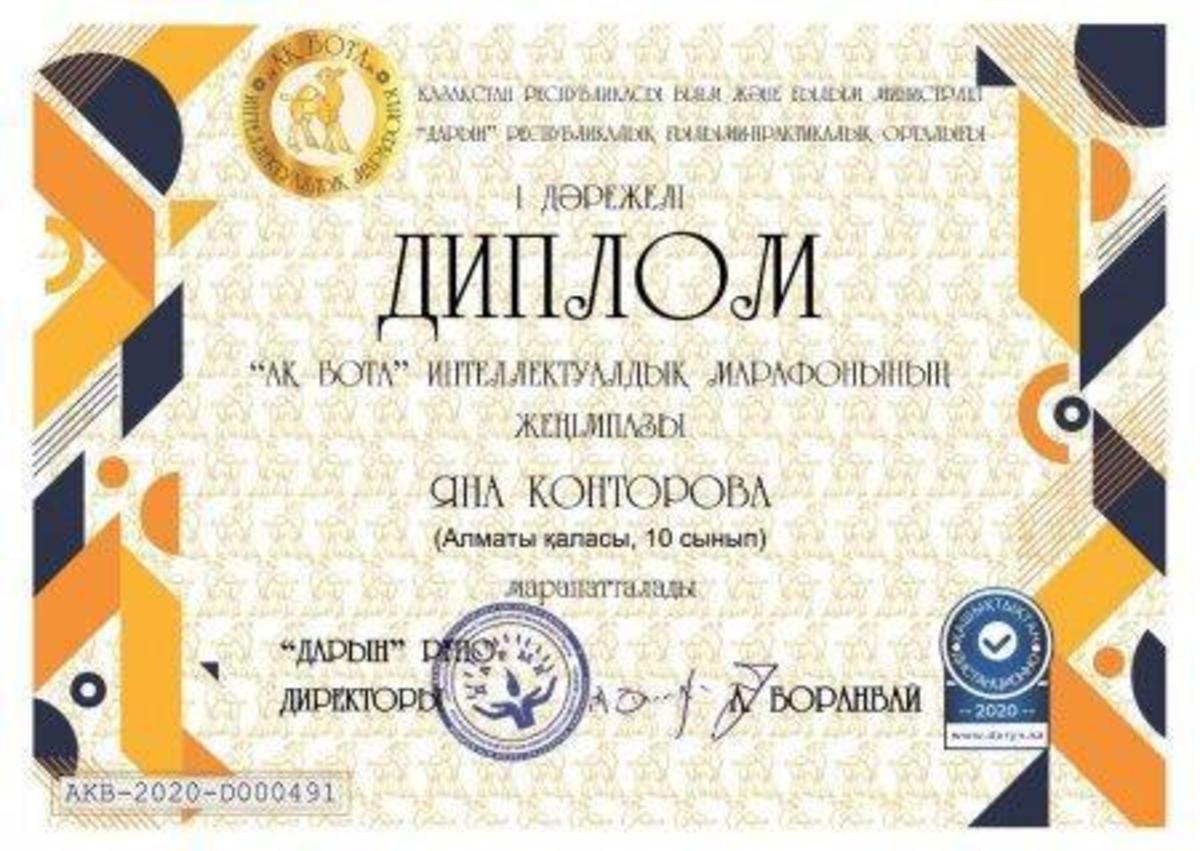 Учащиеся КГУ ОШ 50 приняли активное участие в интеллектуальном марафоне,, АҚ БОТА". Награждены дипломами 1 степени: Айдарханова А., Ибдимин С., Конторова Я. Награждены дипломами 2 степени: Севастьянова М., Савченко Э. Награждены дипломами 3 степени: Кривохижина Л., Вербилова А., Пак Д.