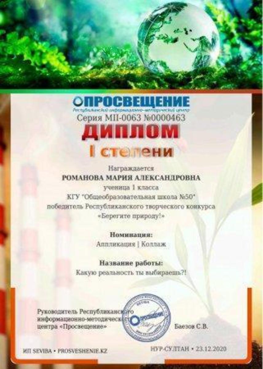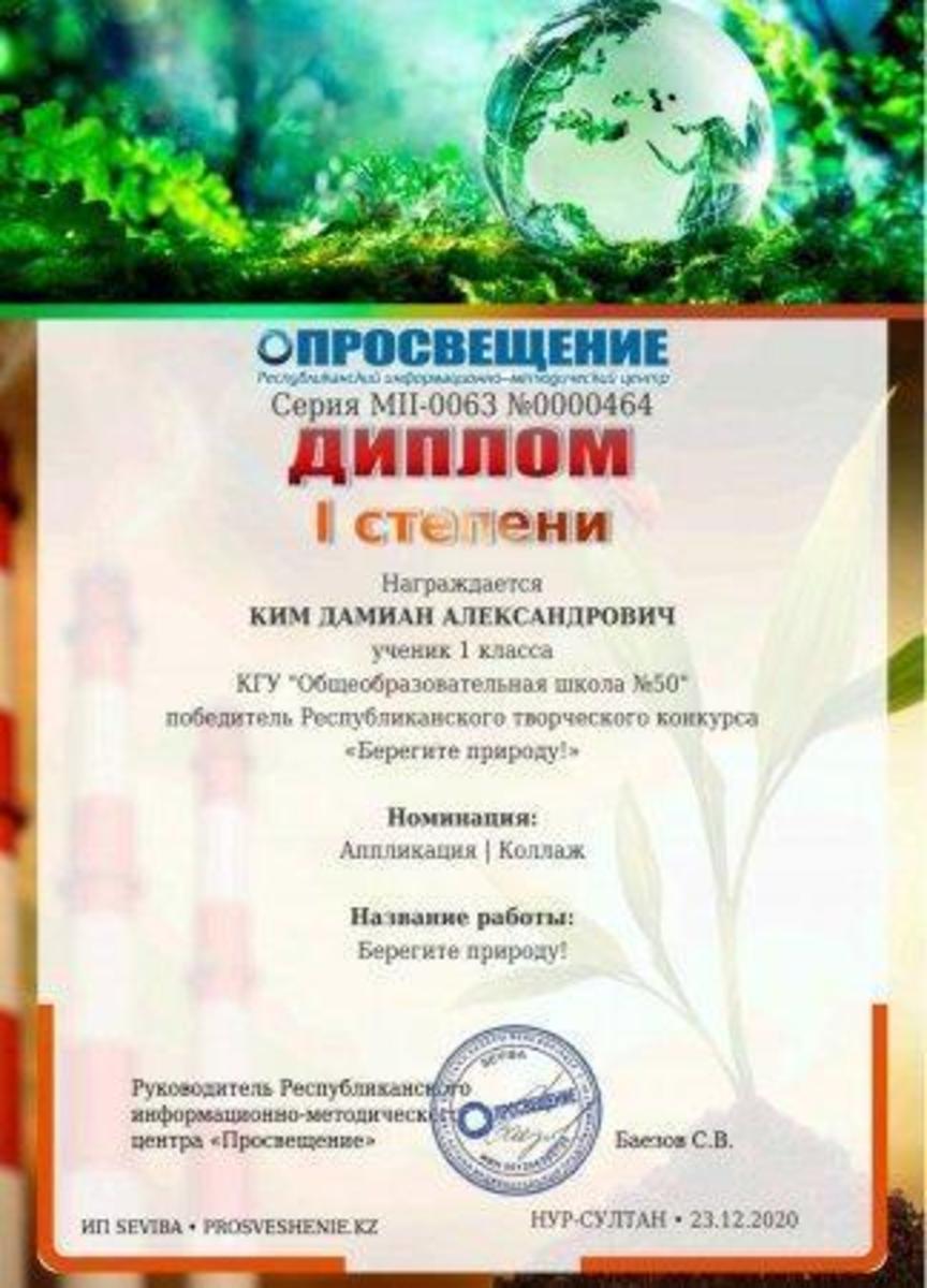 Учащиеся 1,,В"и 2,,Д" классов приняли активное участие в Республиканском творческом конкурсе ,, Берегите природу!" Награждены дипломами 1 степени : Ким Д.,Романова М. - 1,,В"класс., Хакназаров А., Юсупзянов А. - 2,,Д"класс. Классный руководитель: Клинник К. В.