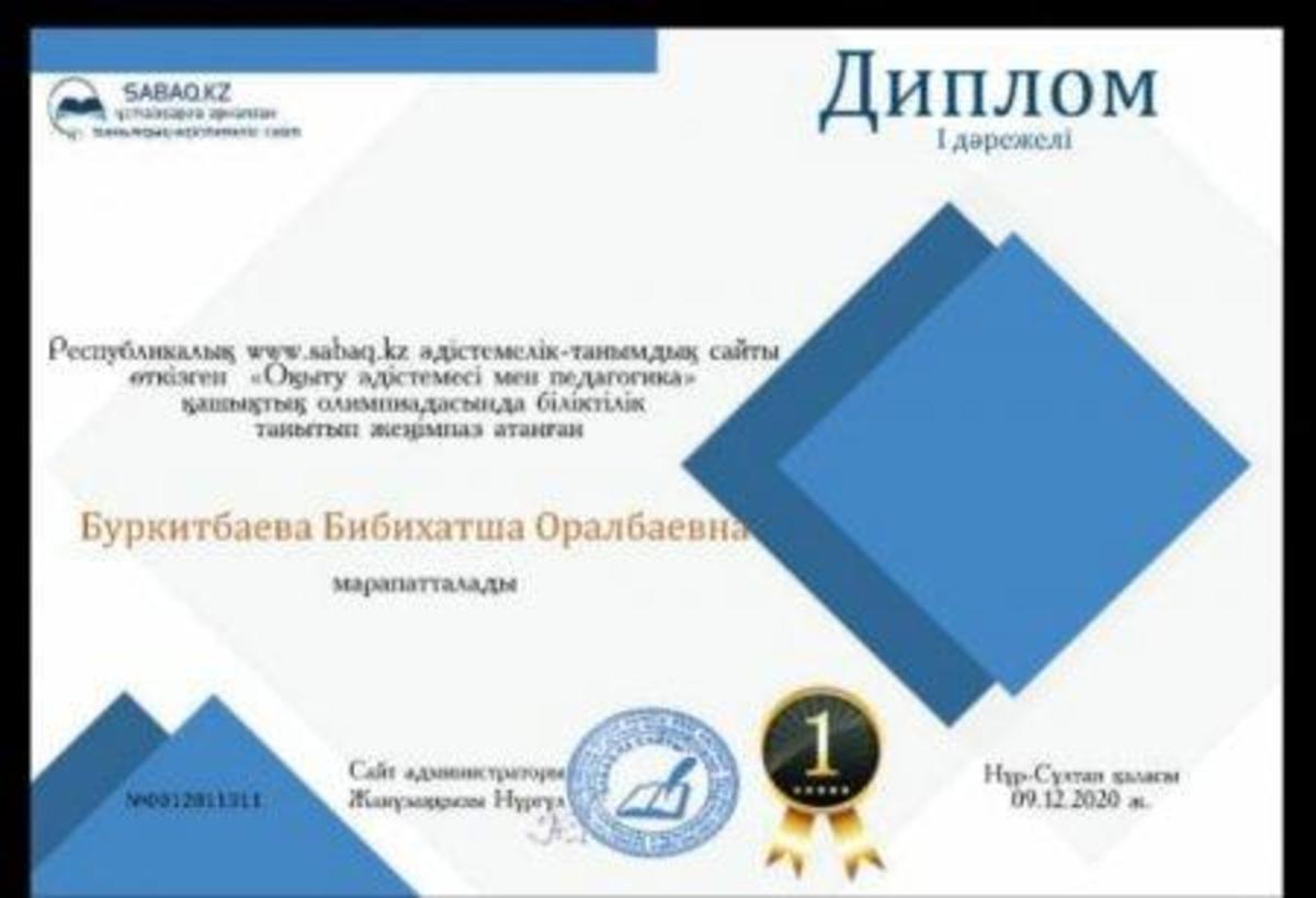 Учитель казахского языка и литературы КГУ ОШ 50 Буркитбаева Б. О. награждена дипломом 1 степени за участие в дистанционной олимпиаде,, Методика обучения и педагогика", проводимой Республиканским учебно-методическим сайтом sabag. kz.