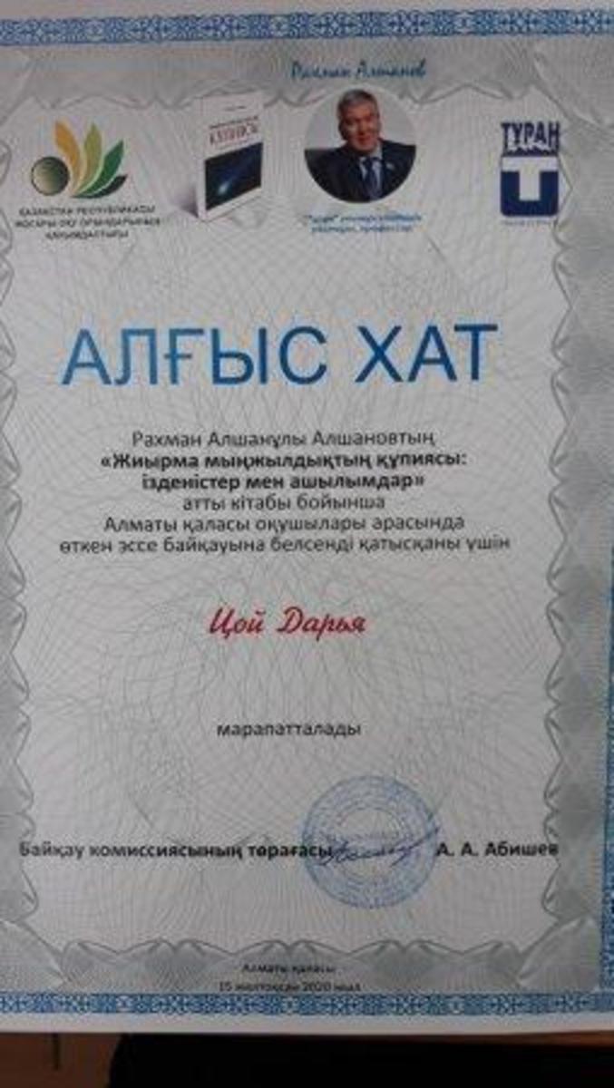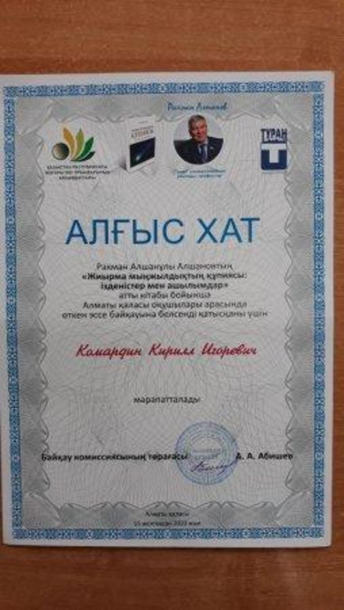 Учащиеся КГУ ОШ № 50 Имершаев Р. – 8 «В» класс, Цой Д. – 8 «В» класс, Комардин К. – 11 «А» класс приняли участие в городском конкурсе эссе «Жиырма мыңжылдықтың кұпиясы: ізденістер мен ашылымдар», награждены благодарственными письмами и памятными подарками.