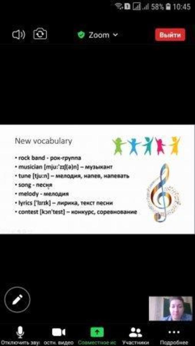 25 қаңтар 2021 0 1 2 3 4 5 Проведен открытый онлайн-урок на тему:,, My favourite music" Учителем английского языка КГУ ОШ 50 Чехлатовой Л. А. с учащимися 5,,А"класса проведен открытый онлайн-урок на тему:,, My favourite music"(Моя любимая музыкальная группа).