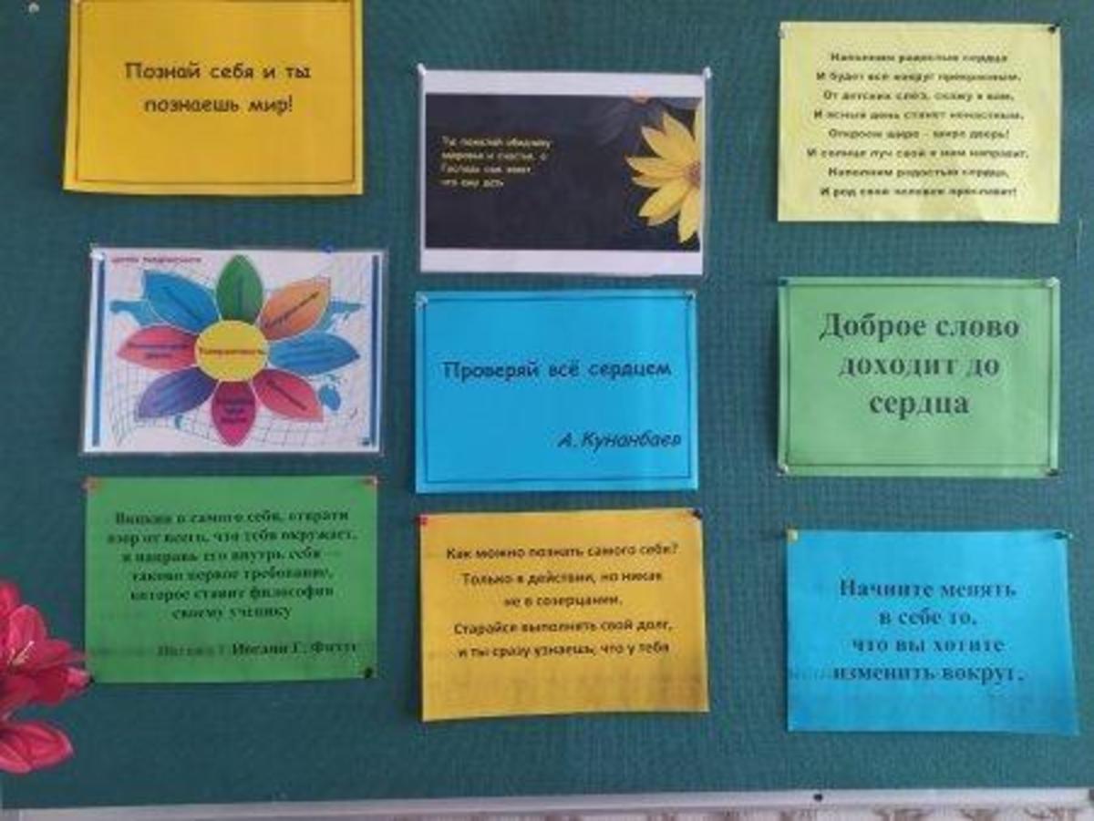 В рамках проведения Республиканской информационной кампании,, Самопознание: педагогика Любви и Творчества "в КГУ ОШ 50 для учащихся 1-11 классов организована выставка цитат автора программы нравственно - духовного образования,, Самопознание" С. А. Назарбаевой,, 12 ступеней нравственно - духовного роста ".