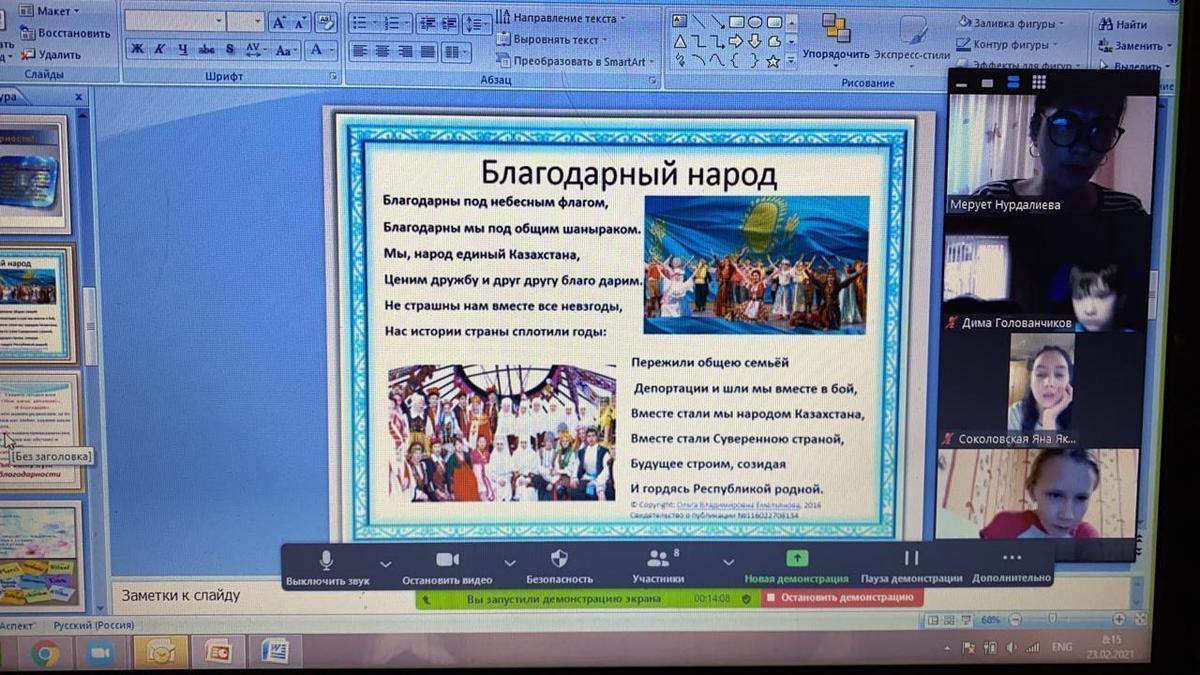 Первый день весны Казахстанцы встретят со словом,, спасибо". Так как 1 марта отмечают молодой, но с очень глубоким смыслом праздник - День благодарности. День благодарения - яркий день казахстанского патриотизма. Первый Президент страны Назарбаев Н. А. 14 января 2016 объявил днем Ассамблеи народов Казахстана, 1 марта - Днём ,, благодарения". Это День благодарности всех этносов друг к другу и к казахам, проявивших милосердие и принявших эти народы, как родных. Классными руководителями 1-11 КГУ ОШ 50 проведены онлайн - классные часы, посвященные этой знаменательной дате.