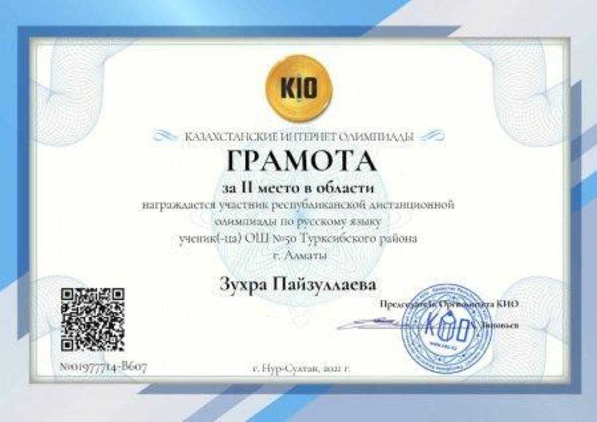 Ученица 9,,Б"класса КГУ ОШ 50 Пайзуллаева Зухра приняла участие в Республиканской дистанционной олимпиаде по русскому языку. Награждена грамотой за 1 место в районе и за 2 место в области. Руководитель : Бикташева Р. В.