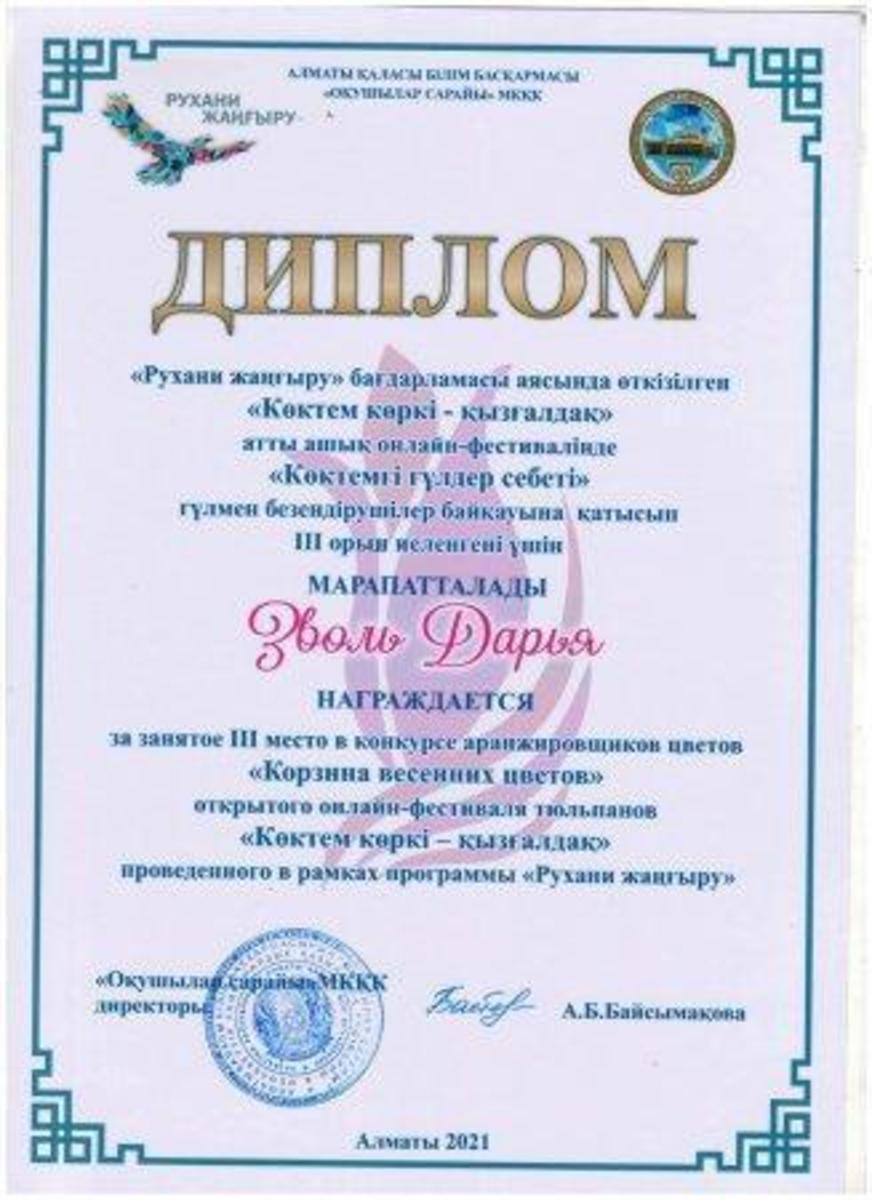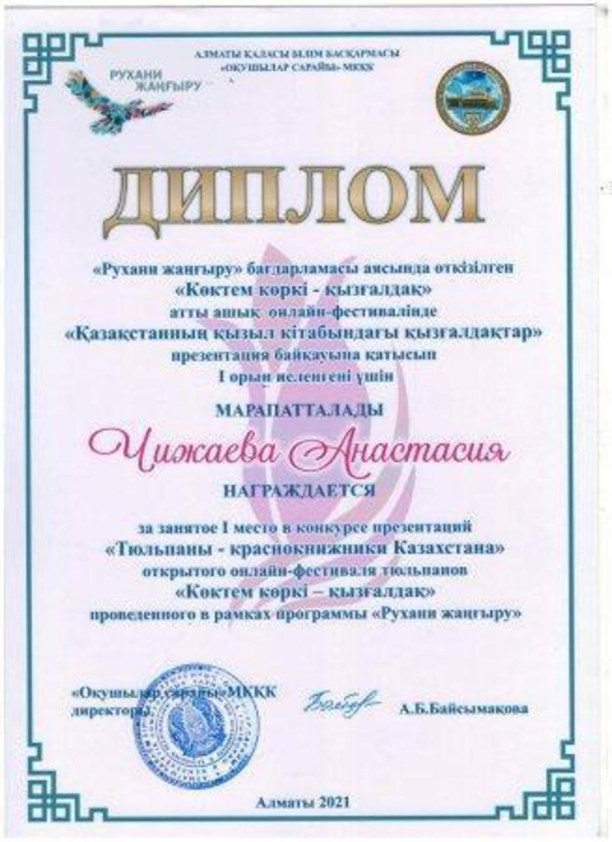В рамках проведения программы ,, Рухани жаңғыру" учащиеся КГУ ОШ 50 приняли активное участие в открытом онлайн - фестивале тюльпанов. Награждены дипломами : Чижаева Анастасия - ученица 8,,А"класса за занятое 1 место в конкурсе презентаций,, Тюльпаны - краснокнижники Казахстана ". Зволь Дарья - ученица 11,,Б"класса за занятое 3 место в конкурсе аранжировщиков цветов,, Корзина весенних цветов". Булатович Карина- ученица 10,,А"класса за активное участие в конкурсе презентаций ,, Тюльпаны - краснокнижники Казахстана ". Руководитель :Луковенкова С. И. - учитель биологии.