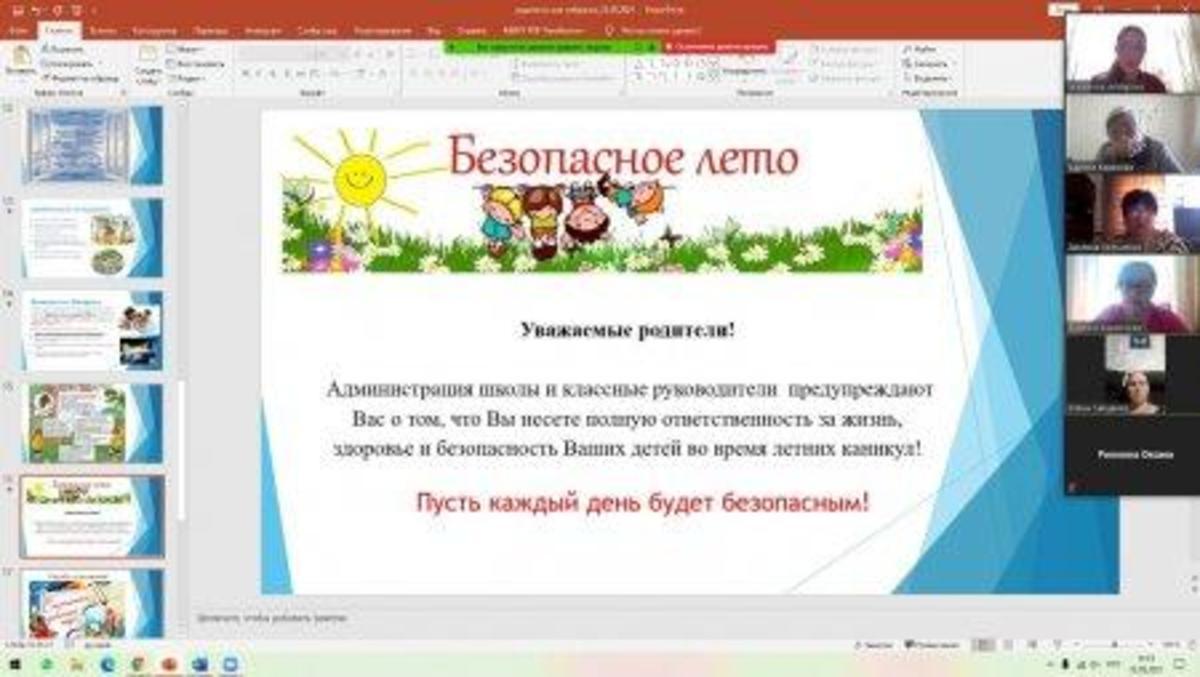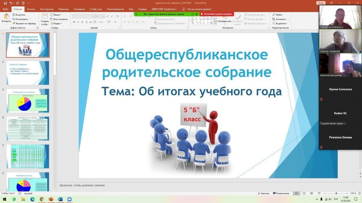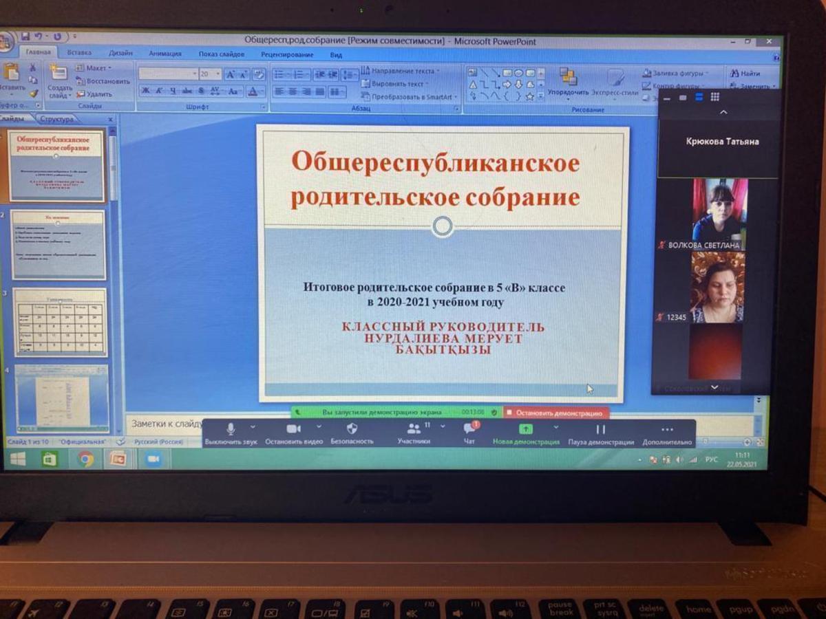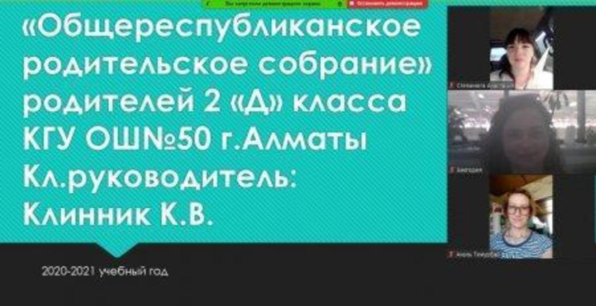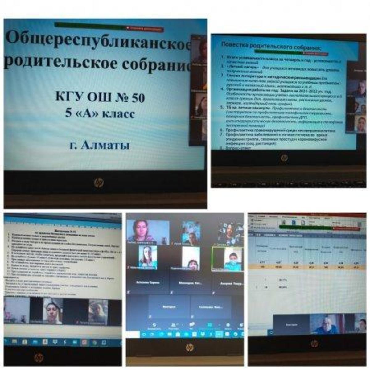 22.05.2021 года классными руководителями 1-11 классов КГУ ОШ 50 в онлайн - формате проведено общереспубликанское родительское собрание на тему :,, Об итогах учебного года." Рассмотрены следующие вопросы : 1.Итоги 2020-2021 учебного года. 2.Организация работы летней школы. 3.Вопросы по школьной форме на 2021 - 2022 учебный год. 4.Последний звонок, выпускной вечер (9-е, 11-е классы). 5.Профилактика правонарушений среди несовершеннолетних подростков - Мусаева Г. И., школьный инспектор, майор полиции Управления полиции Турксибского района. 6.ТБ на летние каникулы. Профилактика и безопасность. (Инструктаж по профилактике телефонного терроризма, пожарная безопасность, профилактика ДТП, ПДД, безопасность на воде, железная дорога, антитеррористическая безопасность, о телефонах экстренной помощи.) 7.Профилактика заболеваний и личная гигиена во время эпидемии гриппа, сезонных простудных заболеваний и коронавирусной инфекции (социальная дистанция).