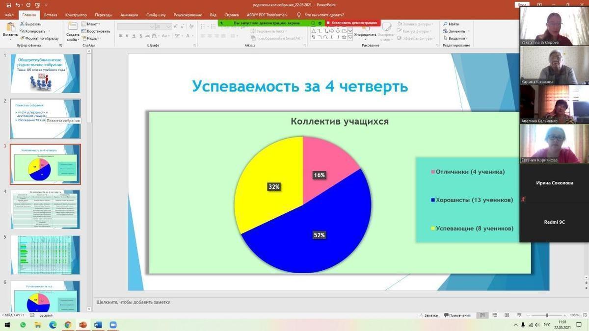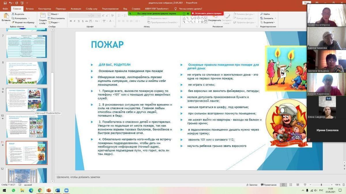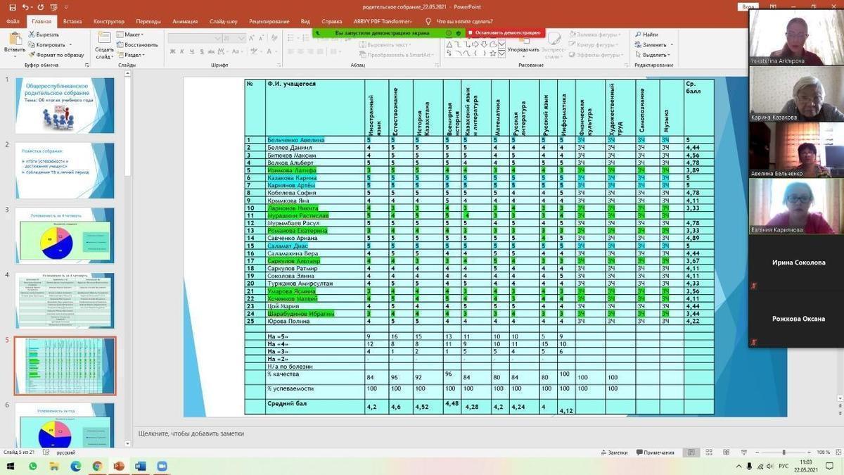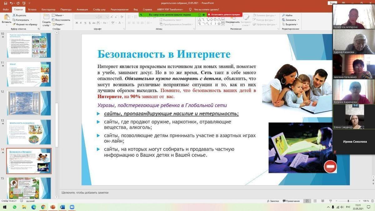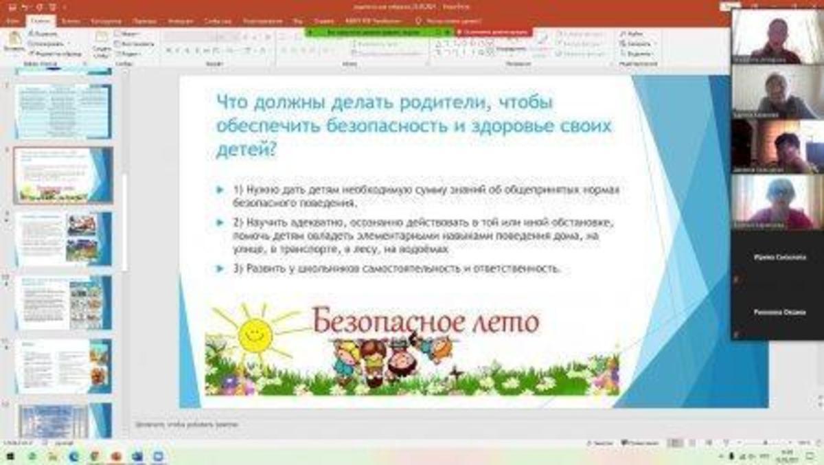 22.05.2021 года классными руководителями 1-11 классов КГУ ОШ 50 в онлайн - формате проведено общереспубликанское родительское собрание на тему :,, Об итогах учебного года." Рассмотрены следующие вопросы : 1.Итоги 2020-2021 учебного года. 2.Организация работы летней школы. 3.Вопросы по школьной форме на 2021 - 2022 учебный год. 4.Последний звонок, выпускной вечер (9-е, 11-е классы). 5.Профилактика правонарушений среди несовершеннолетних подростков - Мусаева Г. И., школьный инспектор, майор полиции Управления полиции Турксибского района. 6.ТБ на летние каникулы. Профилактика и безопасность. (Инструктаж по профилактике телефонного терроризма, пожарная безопасность, профилактика ДТП, ПДД, безопасность на воде, железная дорога, антитеррористическая безопасность, о телефонах экстренной помощи.) 7.Профилактика заболеваний и личная гигиена во время эпидемии гриппа, сезонных простудных заболеваний и коронавирусной инфекции (социальная дистанция).