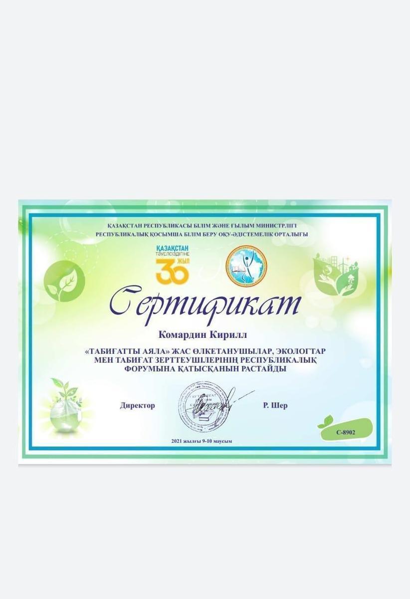 Ученик 11,,А"класса КГУ ОШ 50 Комардин Кирилл принял участие в Республиканском дистанционном форуме юных краеведов, экологов, натуралистов. Награждён сертификатом. Номинация «История родного края» - виртуальное путешествие. Виртуальная 3D панорама: знакомство с природой и историческими местами (маршруты, экскурсий) достопримечательностями своего края, природоохранными и заповедными территориями, памятниками природы, природными объектов в 3 D формате. Рабочая среда – SketchUp, Blender.