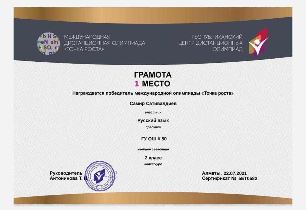 26 шілде 2021 0 1 2 3 4 5 Занял 1 место в Международной дистанционной олимпиаде по русскому языку "Точка роста". Ученик 2 "В" класса КГУ ОШ 50 Сативалдиев Самир занял 1 место в Международной дистанционной олимпиаде по русскому языку "Точка роста".