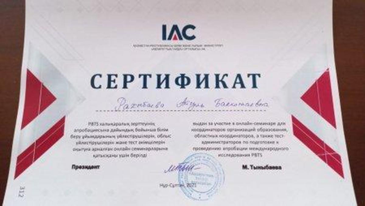 Заместителю директора по учебной работе КГУ ОШ 50 Рахыбаевой А. Б. выдан сертификат за участие в онлайн семинаре для координаторов организаций образования, областных координаторов, а также тест - администраторов по подготовке к проведению апробации международного исследования PBTS.