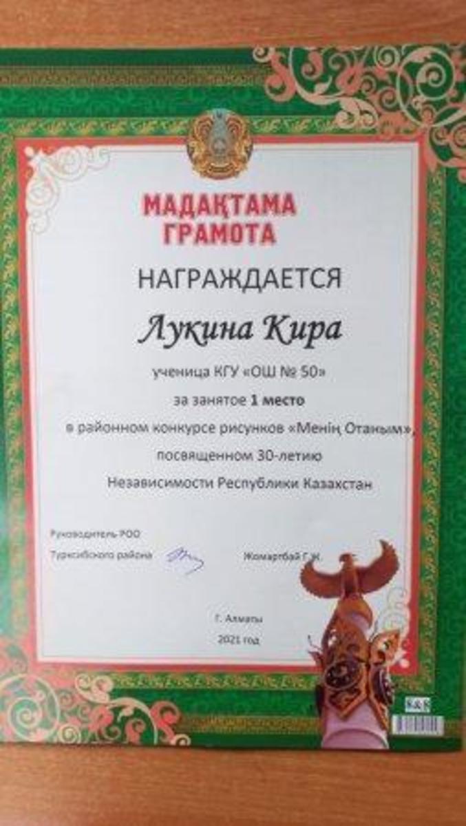 29 қараша 2021 0 1 2 3 4 5 Приняла участие в районном конкурсе рисунков. Ученица КГУ ОШ 50 Лукина Кира приняла участие в районном конкурсе рисунков, посвященном 30 - летию Независимости Республики Казахстан. Награждена грамотой за занятое 1 место.