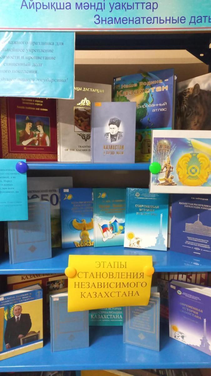 Оформлена книжная выставка на тему :,, Этапы становления Независимого Казахстана ", посвященная 30 - летию Независимости Республики Казахстан