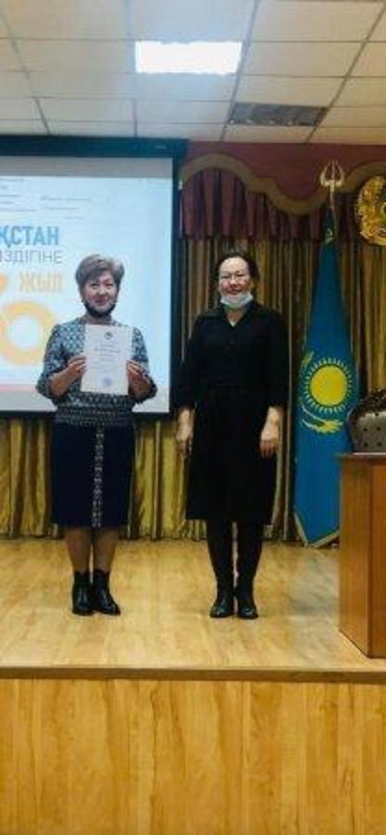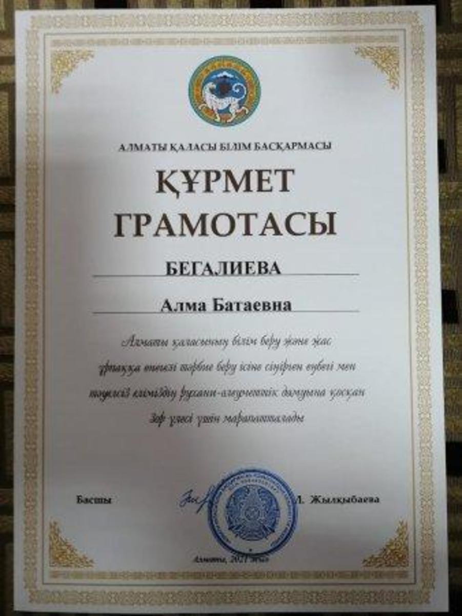 Управлением образования города Алматы вручена почетная грамота учителю начальных классов КГУ ОШ 50 Бегалиевой Алме Батаевне за заслуги в деле нравственного воспитания поколений и большой вклад в духовно - социальное развитие независимой страны.
