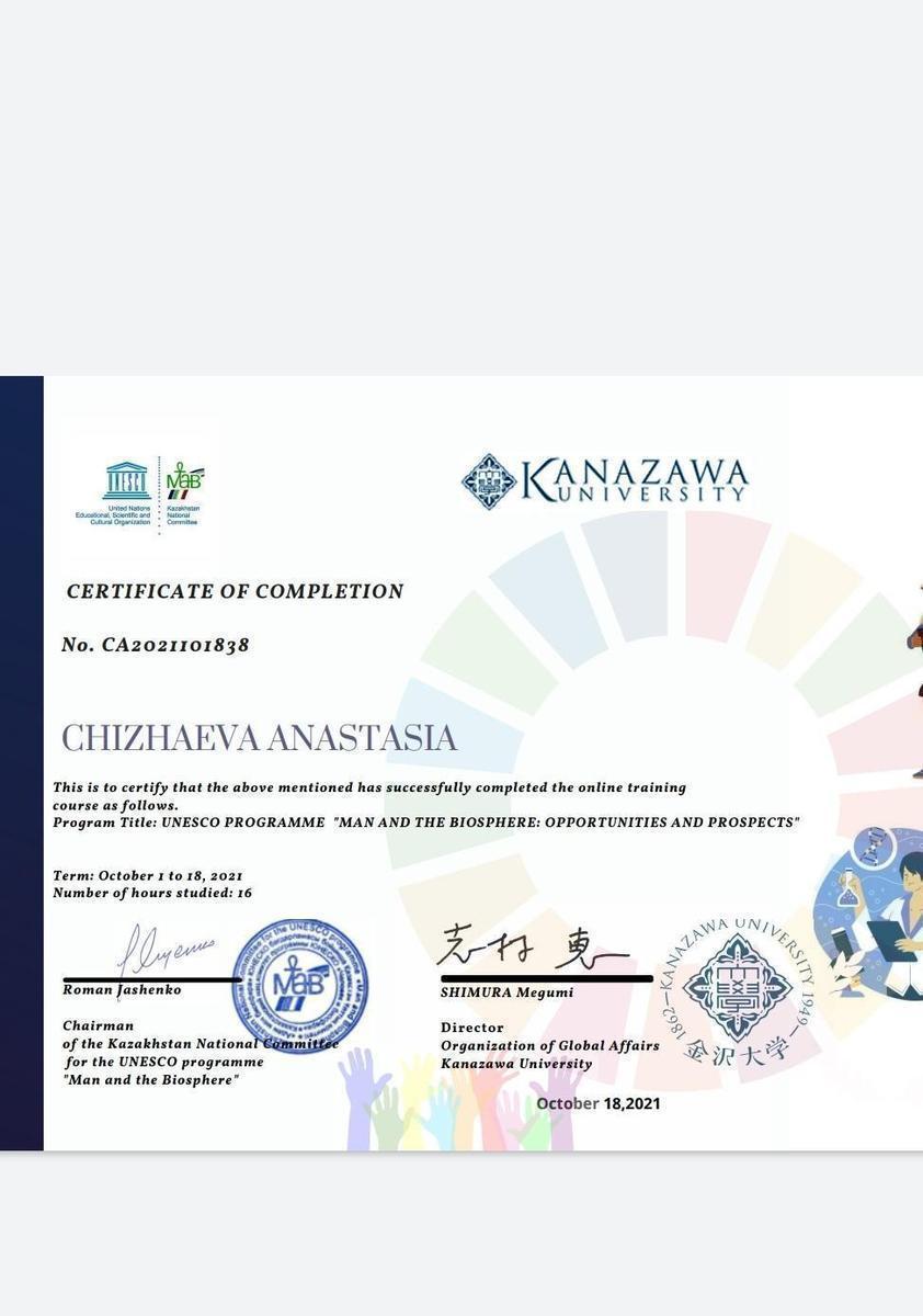05 қаңтар 2022 0 1 2 3 4 5 Получила сертификат об окончании онлайн - курса Ученица 9,,А"класса КГУ ОШ 50 Чижаева Анастасия получила сертификат об окончании онлайн - курса обучения программы ЮНЕСКО,,Человек и Биосфера : возможности и перспективы."