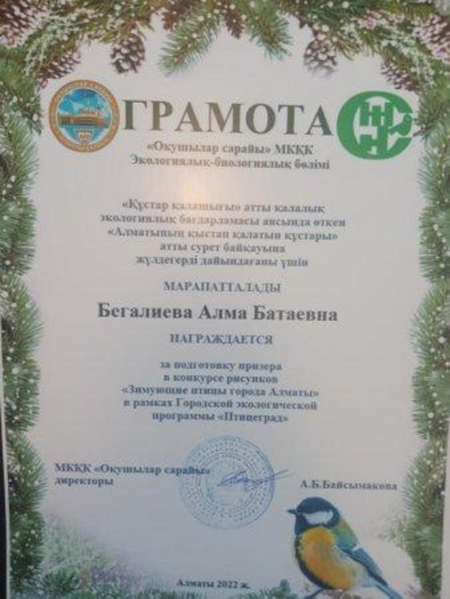 Учитель начальных классов КГУ ОШ 50 Бегалиева А. Б. награждена грамотой за подготовку призера в конкурсе рисунков,, Зимующие птицы города Алматы"в рамках Городской экологической программы,, Птицеград."