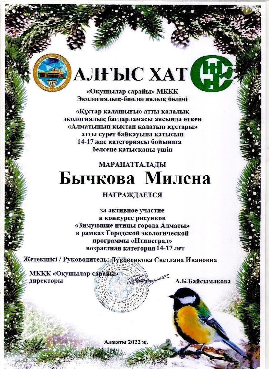 Ученица 8,,Д"класса КГУ ОШ 50 Бычкова Милена награждена грамотой за активное участие в конкурсе рисунков,, Зимующие птицы города Алматы" в рамках Городской экологической программы,, Птицеград." Руководитель : учитель биологии Луковенкова С. И