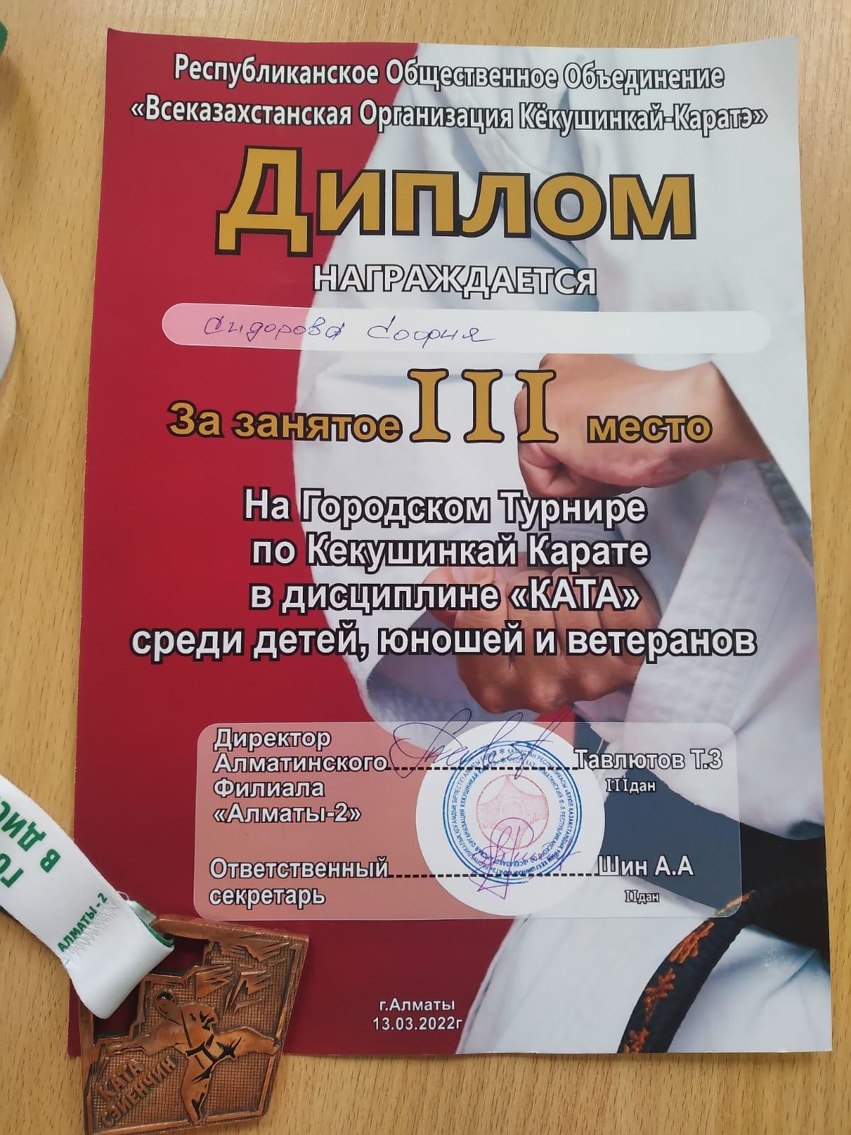29 наурыз 2022 0 1 2 3 4 5 Заняла 3 место в городском турнире по Кекушинкай Карате Ученица 4,,Г"класса КГУ ОШ 50 Сидорова София заняла 3 место в городском турнире по Кекушинкай Карате. Дисциплина ,, Ката."