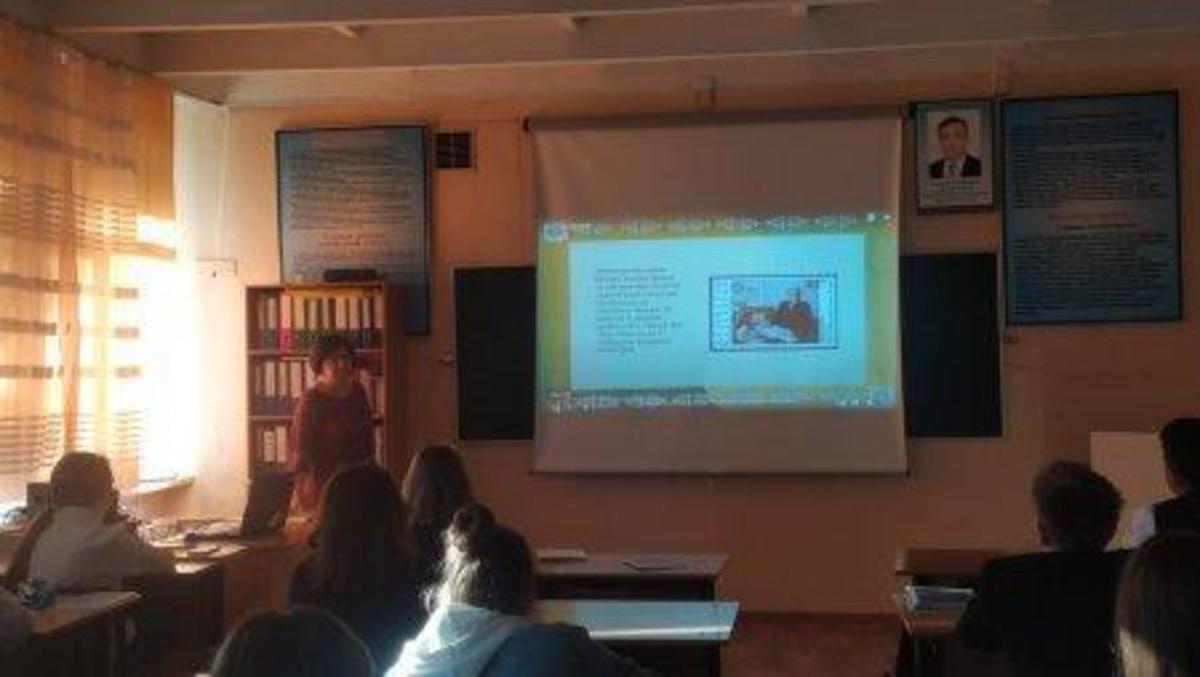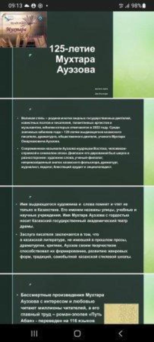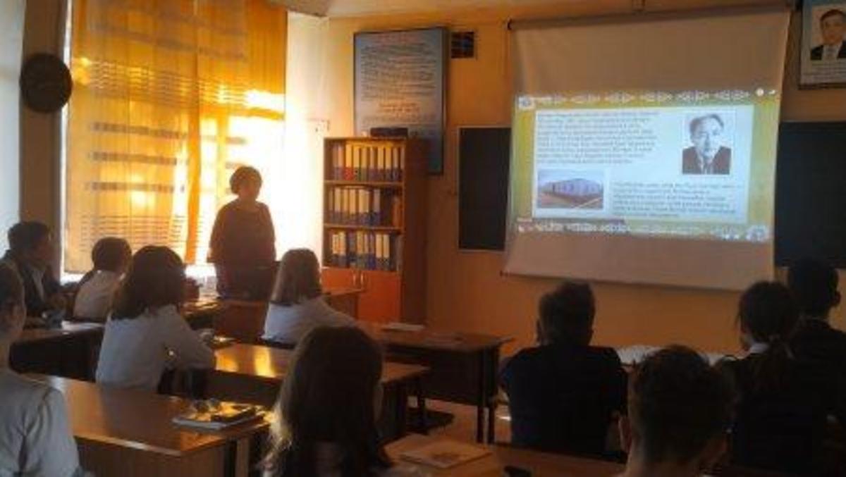 22 қыркүйек 2022 0 1 2 3 4 5 Мұхтар Әуезовтің 125 жылдық мерейтойы № 50 Жалпы білім беретін мектепте Мұхтар Әуезовтің 125 жылдық мерейтойы/ Қазақстан халықтарының Тілдер күні апталығына 8 «В» сынып жетекшісі Смернова С.О оқушылармен сабақтан тыс сынып сағатын өткізді.
