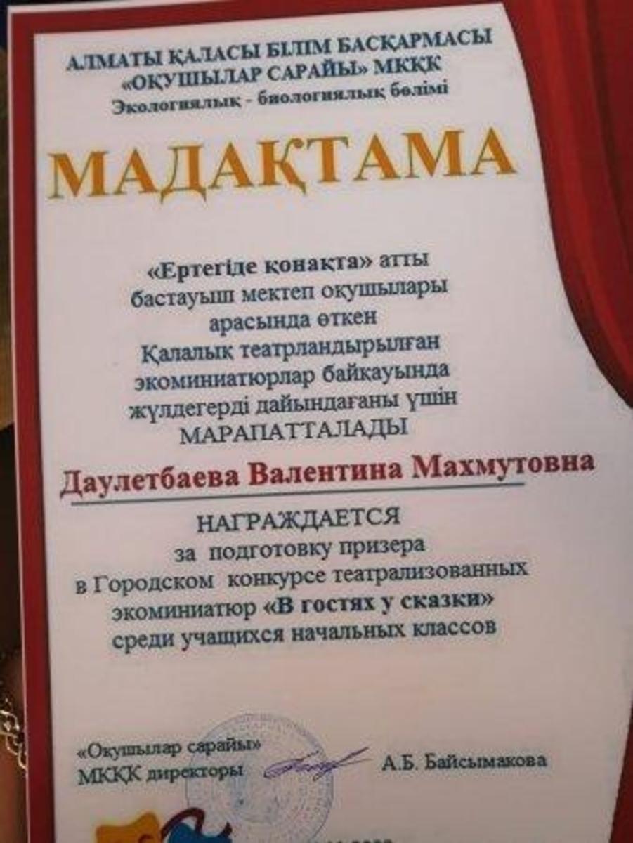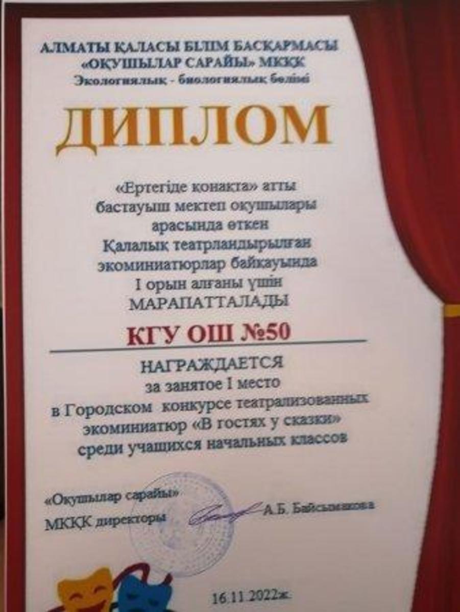 Бастауыш сынып оқушылары арасында өткен «Ертегігелер еліне саяхатқа бару» атты қалалық театрландырылған экоминиатюр байқауында мектеп командасы 1 орынға ие болды (жетекшісі: Даулетбаева В.М.).