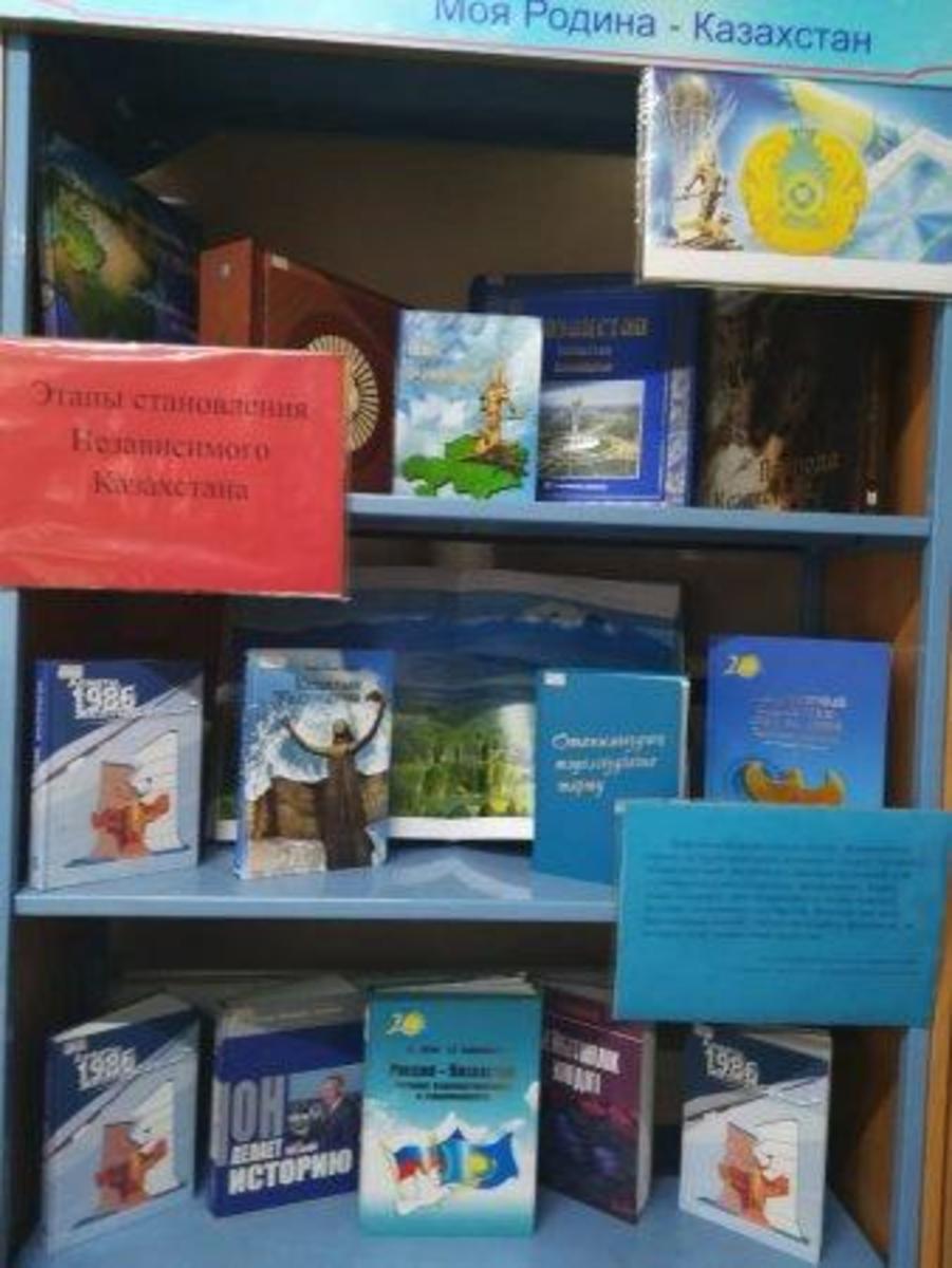 Ко Дню Независимости Республики Казахстан, заведующей библиотекой КГУ ОШ № 50 Щербаковой С.А. оформлена книжная выставки «Этапы становления Независимого Казахстана».