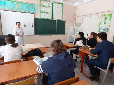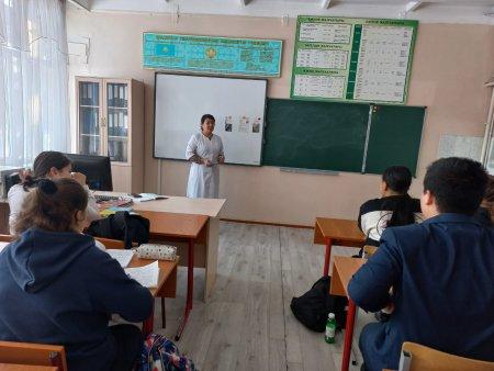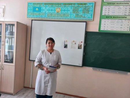 №50 Жалпы білім беретін мектептің медицина қызметкері Үйсінбаева Ш.А. 9-11 сынып оқушыларымен «Есірткі – зиян, есірткі – зұлымдық» атты әңгіме өткізілді. Медицинским работником школы Уйсинбаевой Ш.А. с учащимися 9-11-х классов проведена беседа «Наркотики – вред, наркотики – зло».