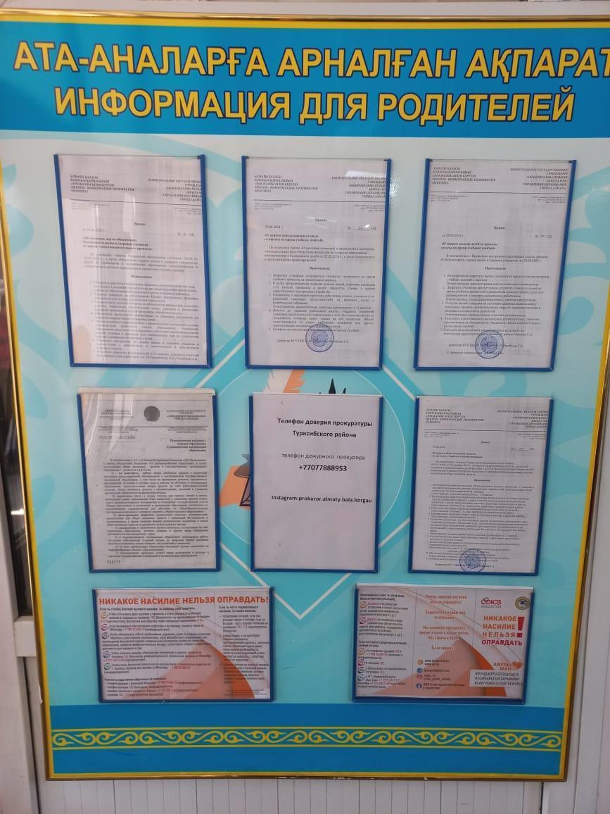 Балалардың құқықтарын қорғау жөніндегі әлеуметтік қызметтердің мекенжайлары мен орталықтарының телефондары бар ата-аналарға арналған ақпараттық бұрыш жаңартылды.