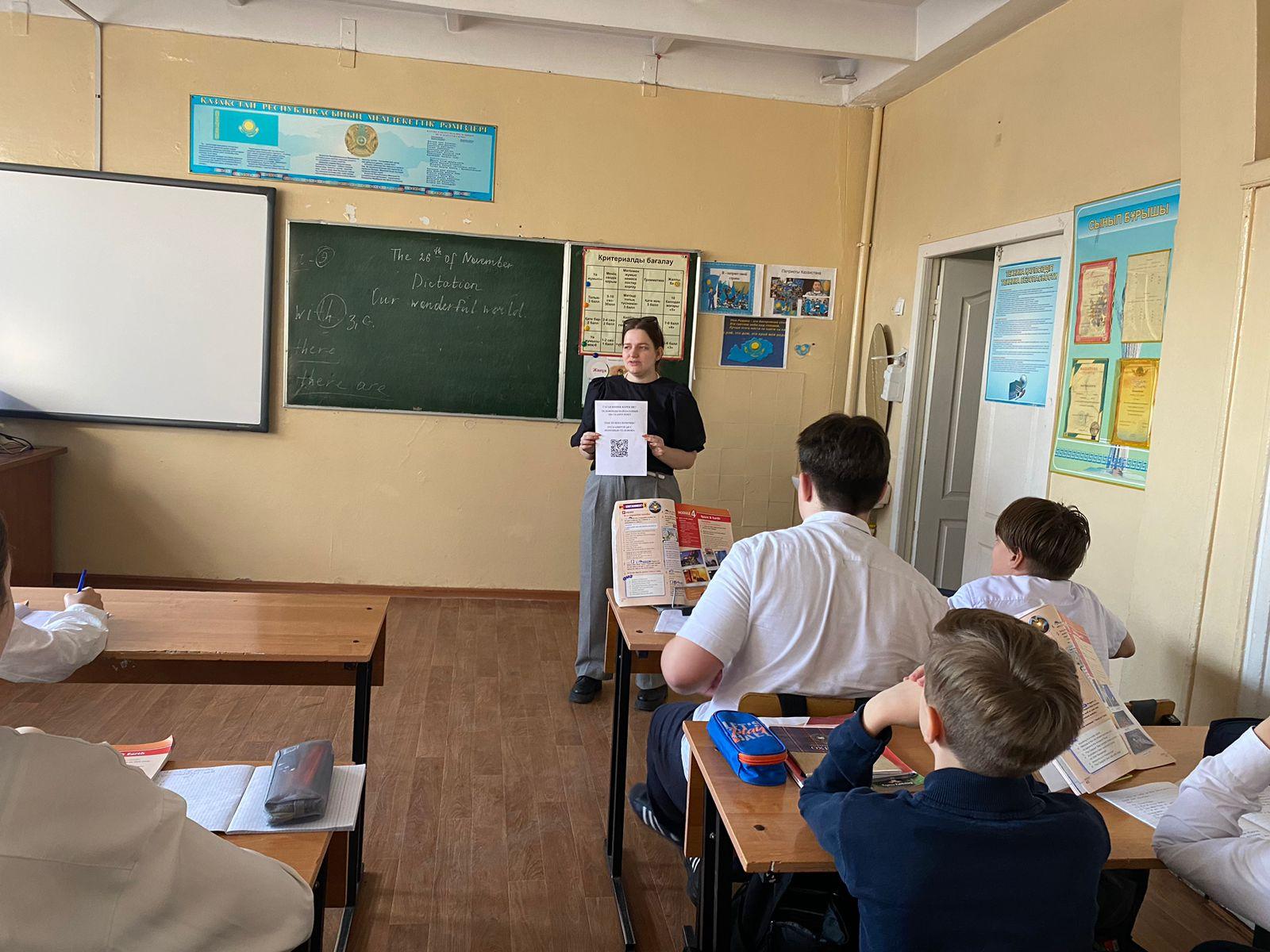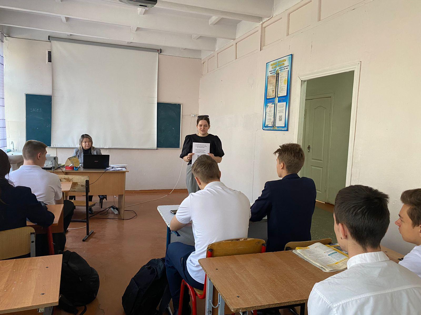 № 50 ЖББМ КММ-де педагог-психолог Е. О. Гадаева оқушылармен психологиялық кеңес беру және өмірлік қиын жағдайда көмек көрсету мақсатында анонимді өтініштер үшін QR-кодты пайдалану ережелерін қайта түсіндірді.