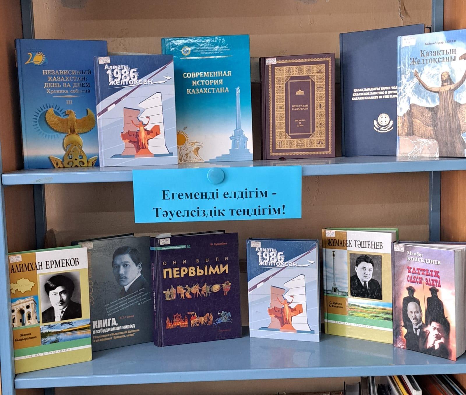Кітап көрмесі. Книжная выставка.Қазақстан Республикасының Тәуелсіздік күніне орай № 50 ЖББМ КММ кітапхана меңгерушісі С. А. Щербакова «Егеменді елдігім - Тәуелсіздік теңдігім!».
