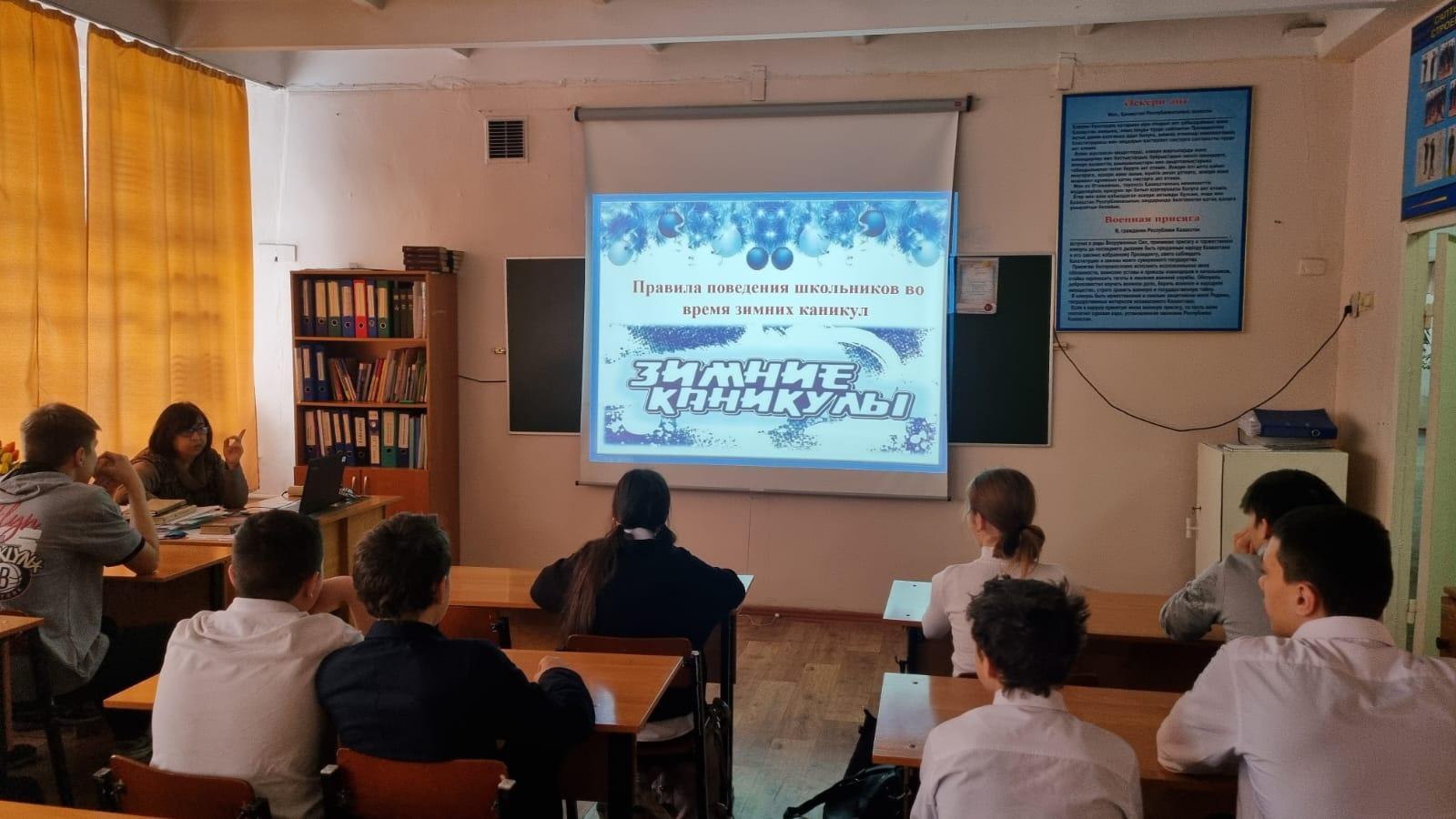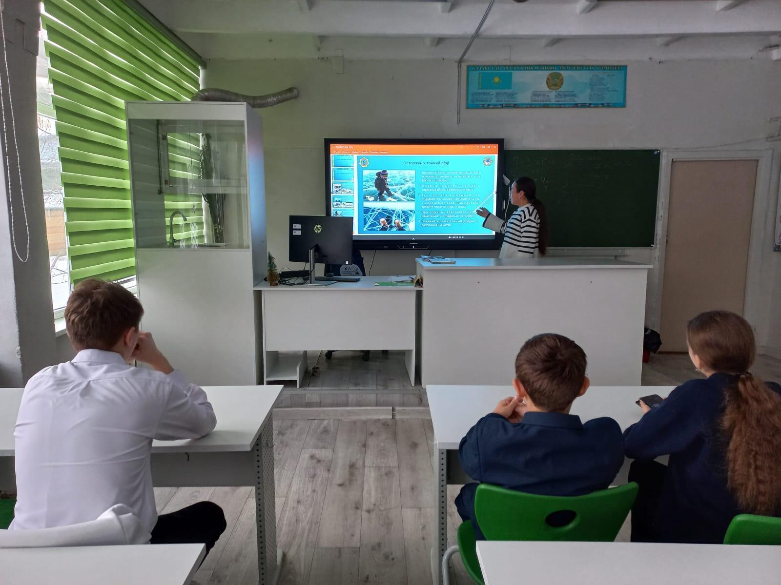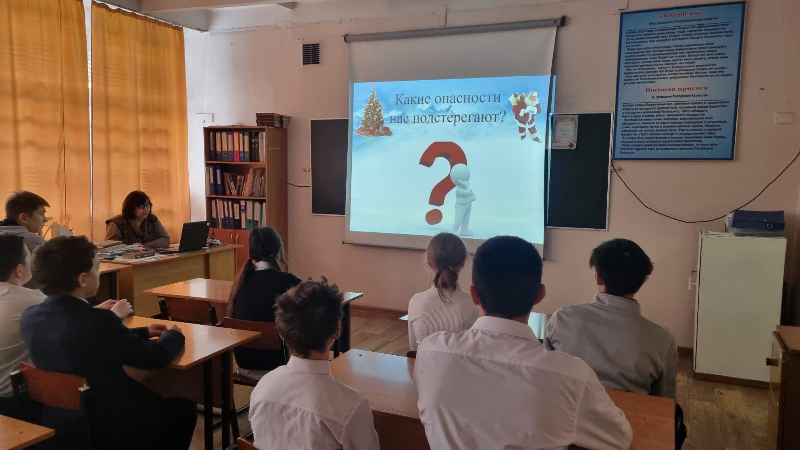 С целью обеспечения безопасности детей во время зимних каникул, в КГУ ОШ № 50 классными руководителями 1-11 классов с учащимися проведен «Урок безопасности», на котором проведены профилактические беседы по пожарной безопасности, поведению на дороге, воде, железной дороге, в транспорте, общественных местах, о запрете использования пиротехнических изделий, об опасности на водоемах и тонком льде.