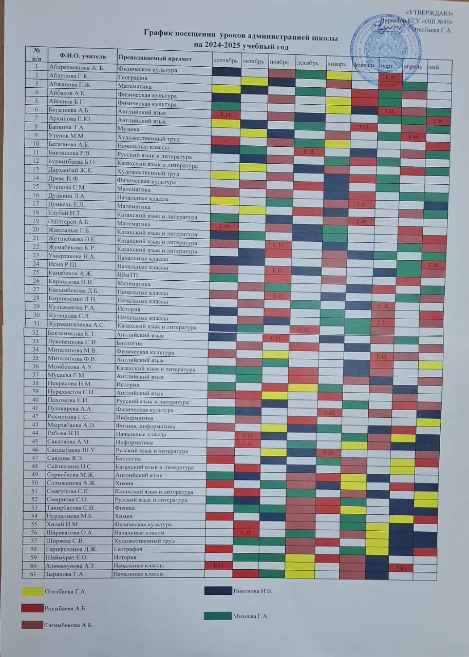 05 қыркүйек 2024 0 1 2 3 4 5 Мектеп әкімшілігінің 2024-2025 оқу жылына арналған сабаққа қатысу кестесі.График посещения уроков админимтрацией школы на 2024-2025 учебный год.