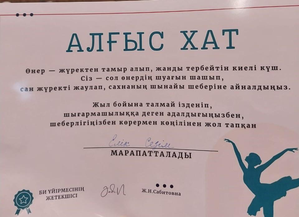 Ученица 3 «Ә» класса КГУ ОШ № 50 Турксибского района г. Алматы Елік Сезім приняла участие в танцевальном конкурсе «Таlant SHOW» и завоевала «Гран-при».