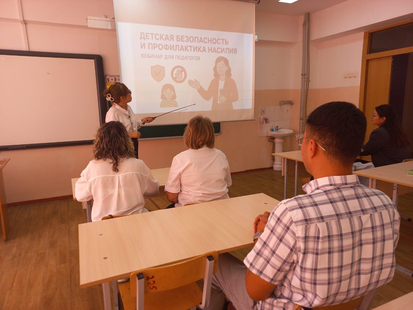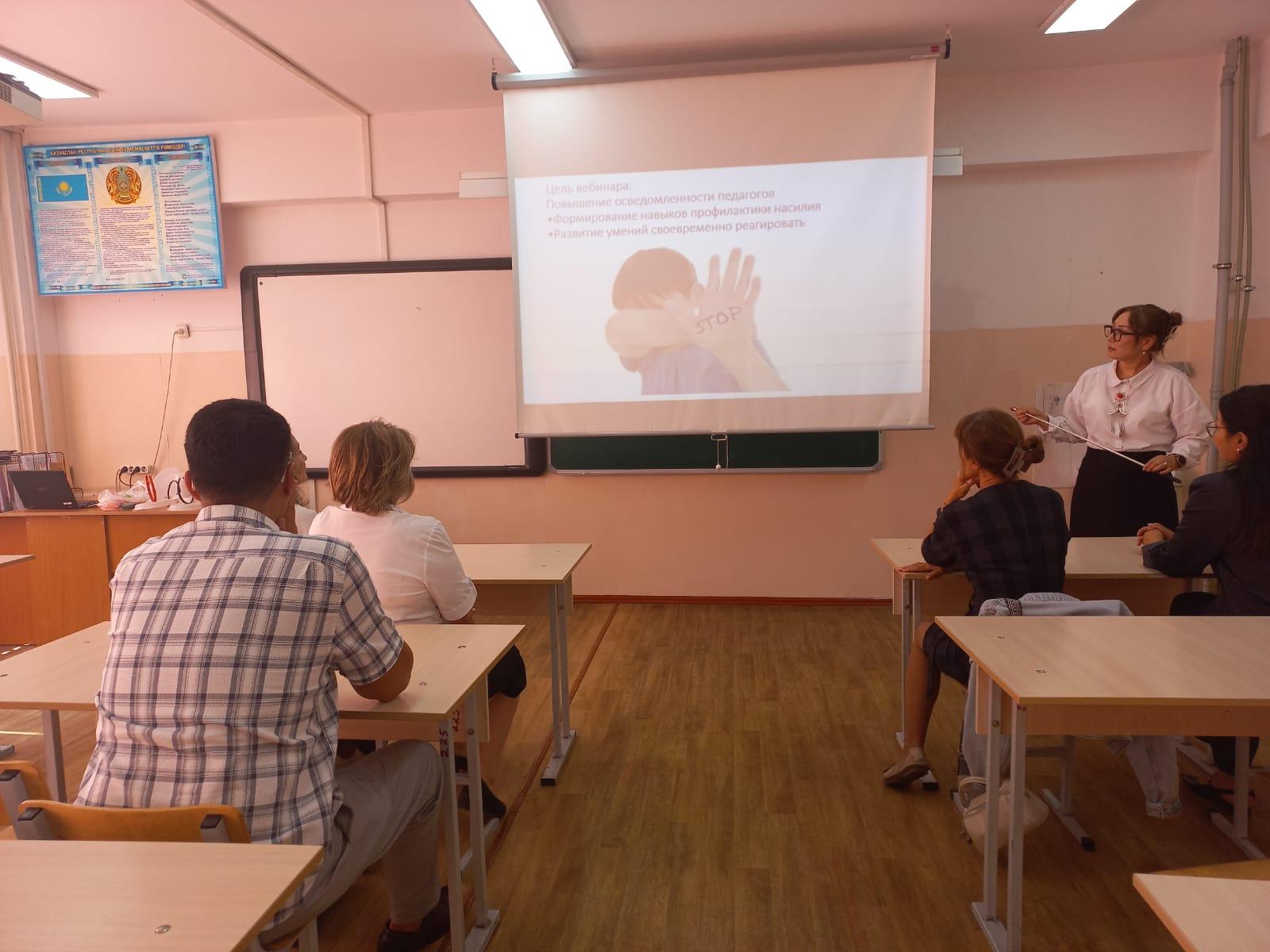 В целях усиления работы по обеспечению детской безопасности и профилактике насилия в КГУ ОШ № 50 педагогом-психологом Кожагуловой Н.Д. для педагогов проведен вебинар на тему: «Детская безопасность и профилактика насилия», направленный на повышение компетенций педагогов в вопросах раннего выявления и реагирования на случаи буллинга и других форм агрессии. Педагоги получили знания об алгоритмах действий в кризисных ситуациях, методах профилактики, а также практические инструменты по поддержке детей.