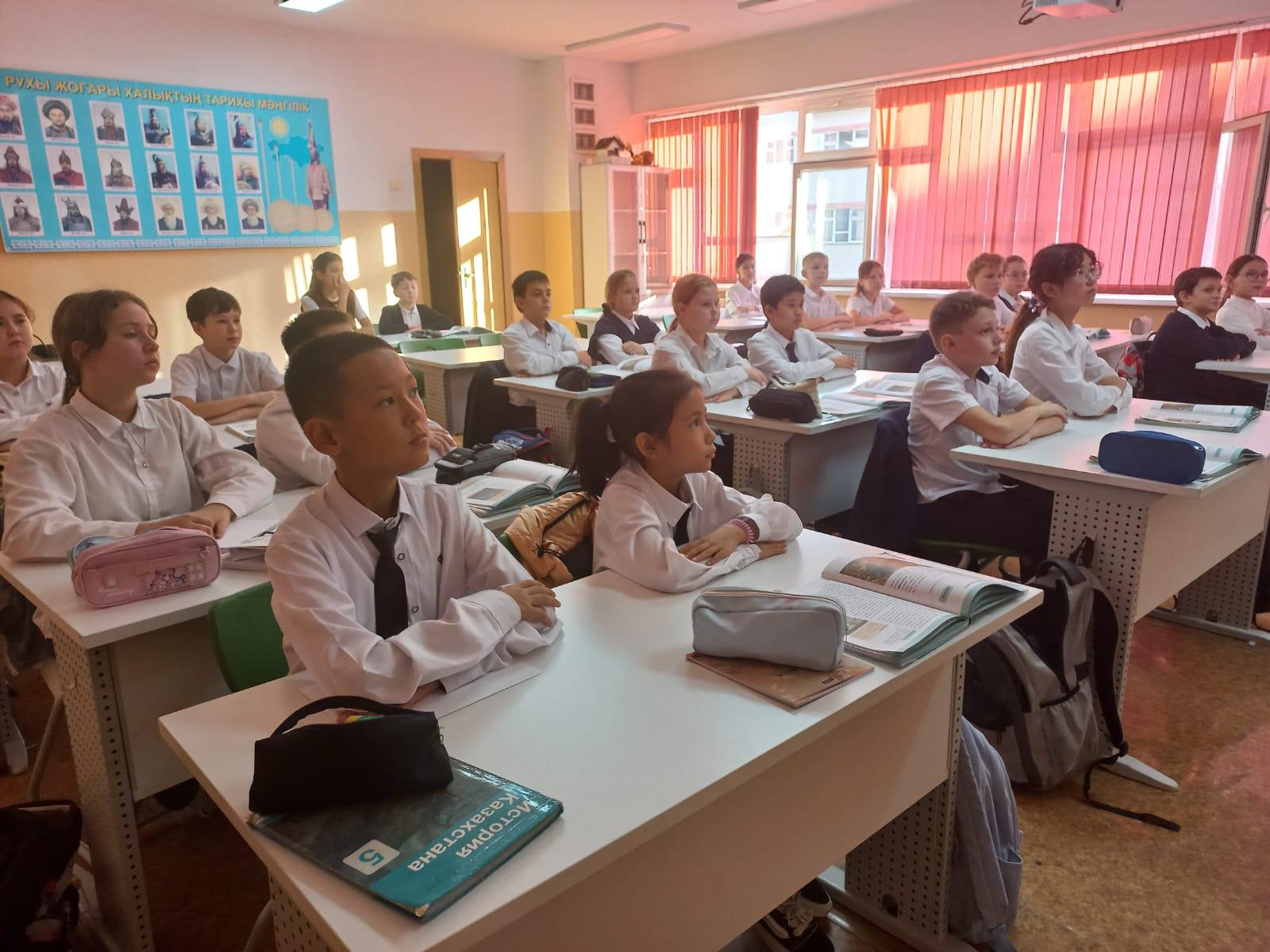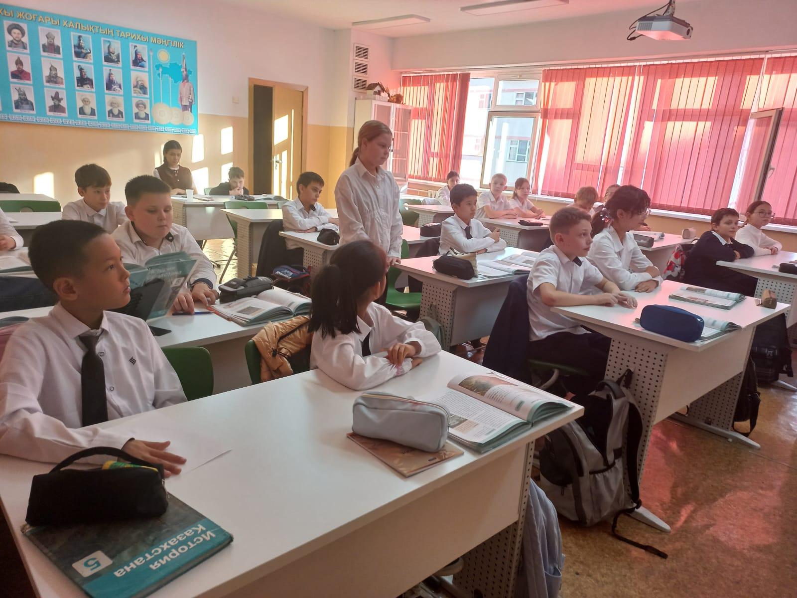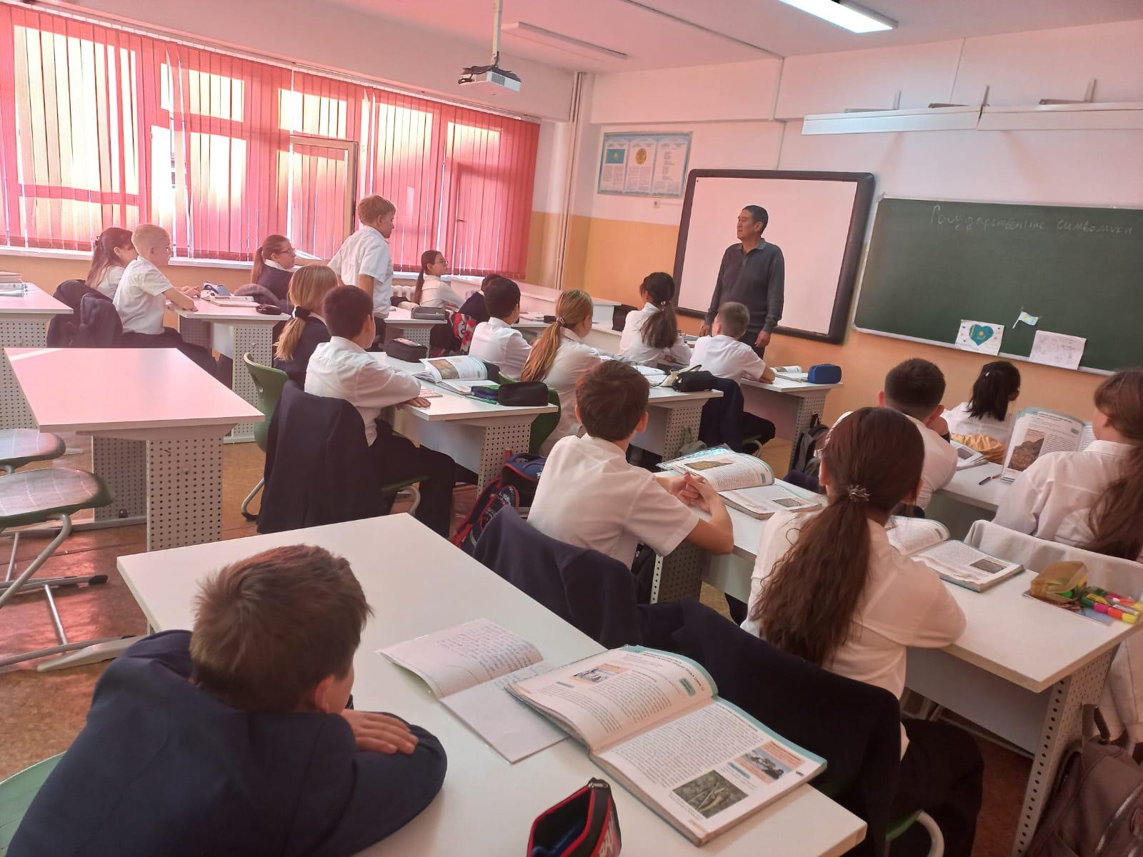 Қазақстан Республикасы күніне орай тарих пәнінің мұғалімі М. Е. Егізбаев 5-сынып оқушыларымен «Қазақстан Республикасының рәміздерін білесің бе?».