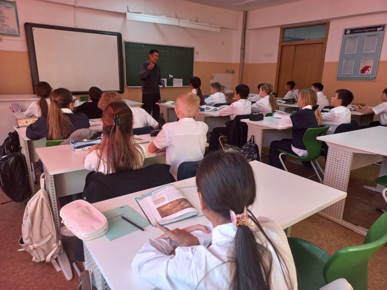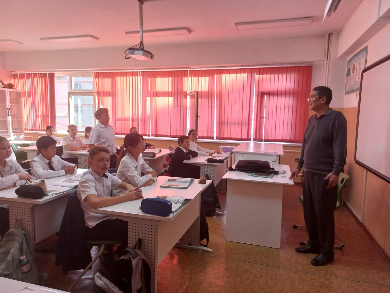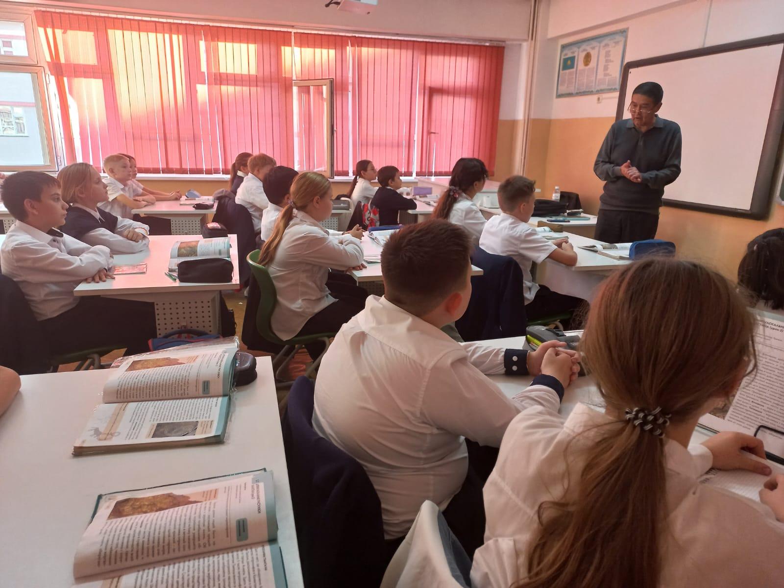 Қазақстан Республикасы күніне орай тарих пәнінің мұғалімі М. Е. Егізбаев 5-сынып оқушыларымен «Қазақстан Республикасының рәміздерін білесің бе?».