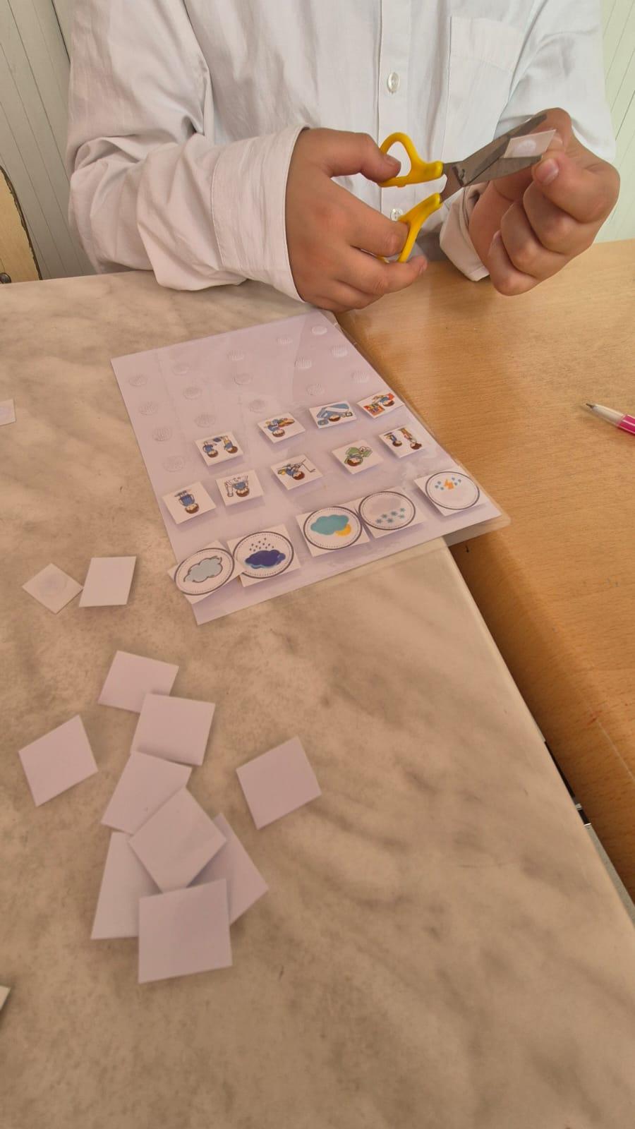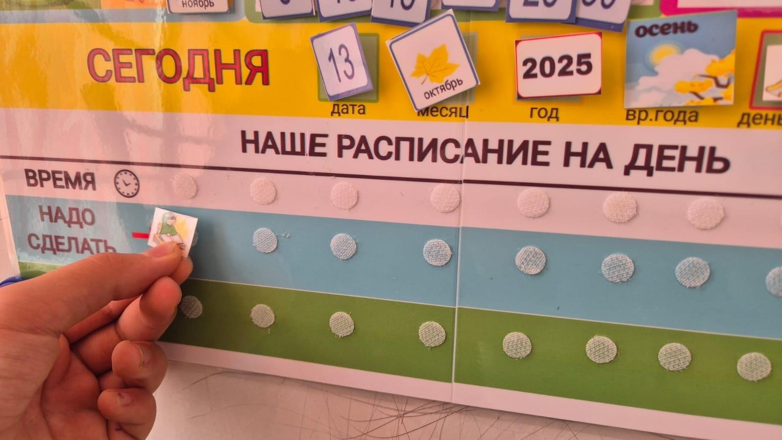 На занятии дети совместно с логопедом составляли визуальное расписание учебного дня, используя карточки с изображением действий, предметов и эмоций. Каждый ребёнок оформлял собственный «день» — от прихода в школу до окончания занятий.