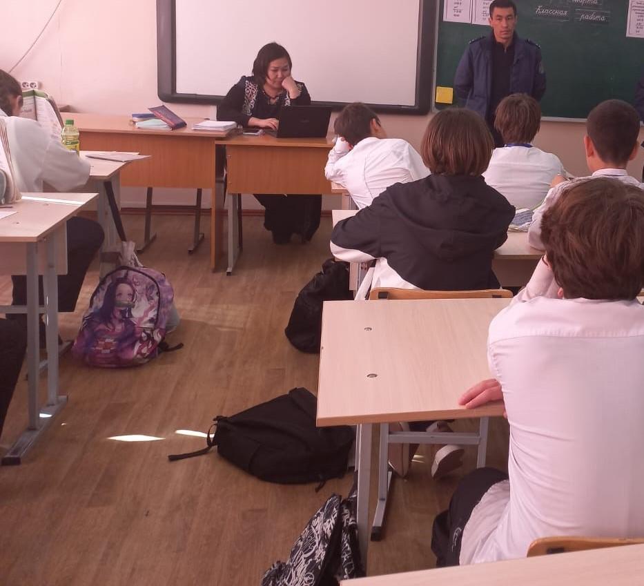 № 50 ЖББМ КММ-де ювеналды полиция бөлімінің учаскелік полиция инспекторы полиция лейтенанты Е. Н. Жұманов 9-сынып оқушыларымен 53 адаммен «Қылмыстық және әкімшілік жауапкершілік қай жастан басталады» тақырыбында әңгіме өткізді.