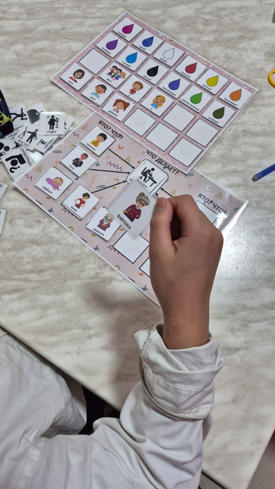 Создание пиктограмм использовалось как инструмент визуальной организации: дети подбирали и располагали изображения простых действий — писать, говорить, играть — и применяли их для планирования и организации своей деятельности на занятиях.