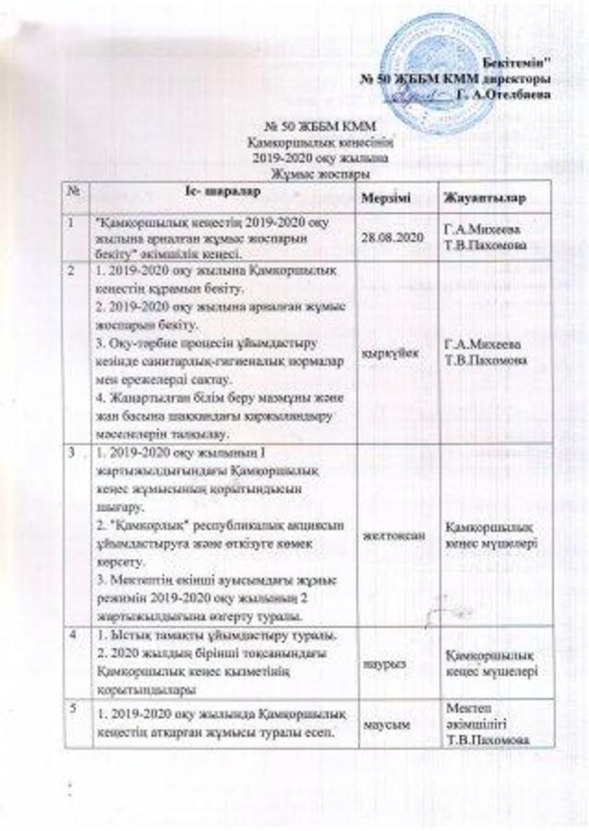 Қамқоршылық кеңестің 2020-2021 оқу жылына арналған жұмыс жоспары. План работы Попечительского совета на 2020-2021 учебный год