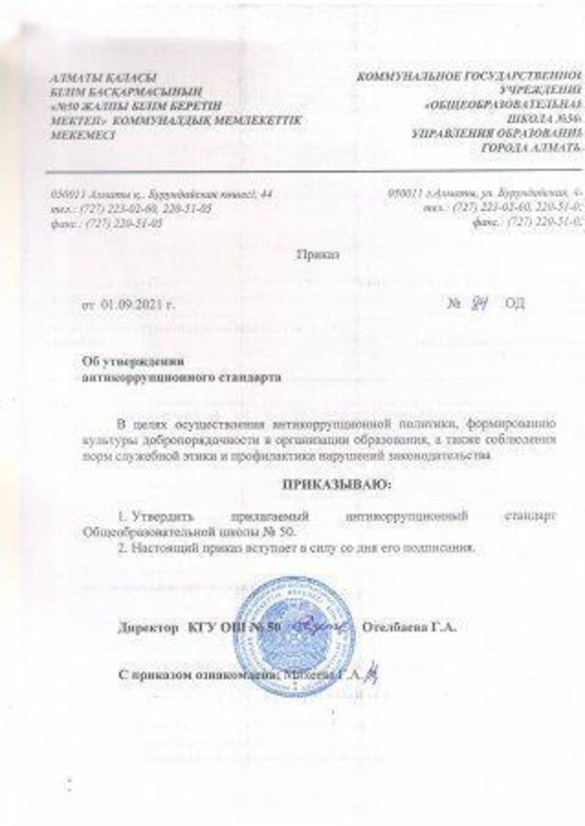 01 қыркүйек 2021 0 1 2 3 4 5 Сыбайлас жемқорлыққа қарсы стандартты бекіту туралы бұйрық. Приказ об утверждении антикоррупционного стандарта